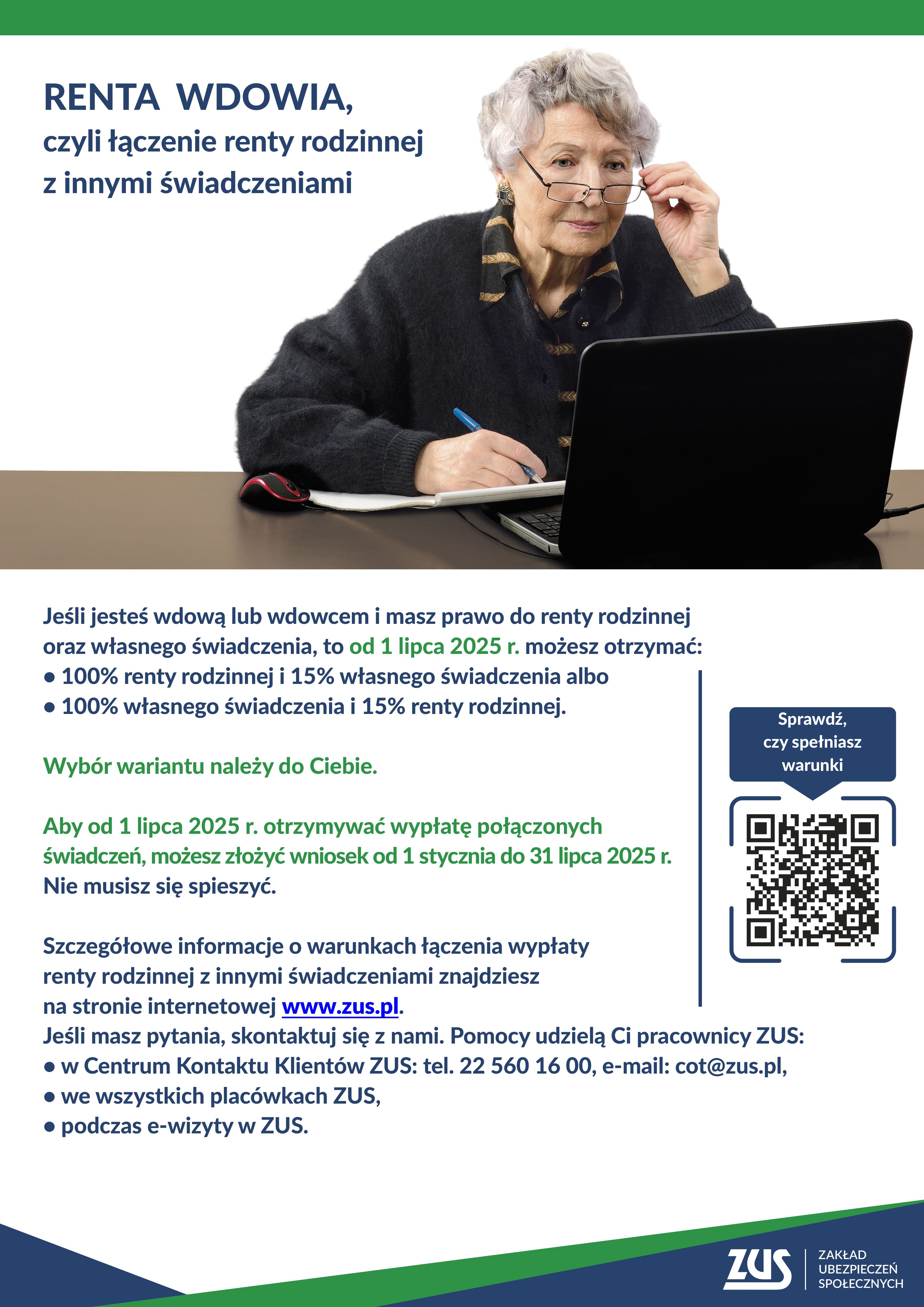 Od stycznia 2025 r. ankieta do renty wdowiej została połączona z kalkulatorem do wyliczenia szacunkowej kwoty połączonych świadczeń. Kalkulator dostępny jest na stronie zus.pl – link Kalkulator renta wdowia - ZUS.