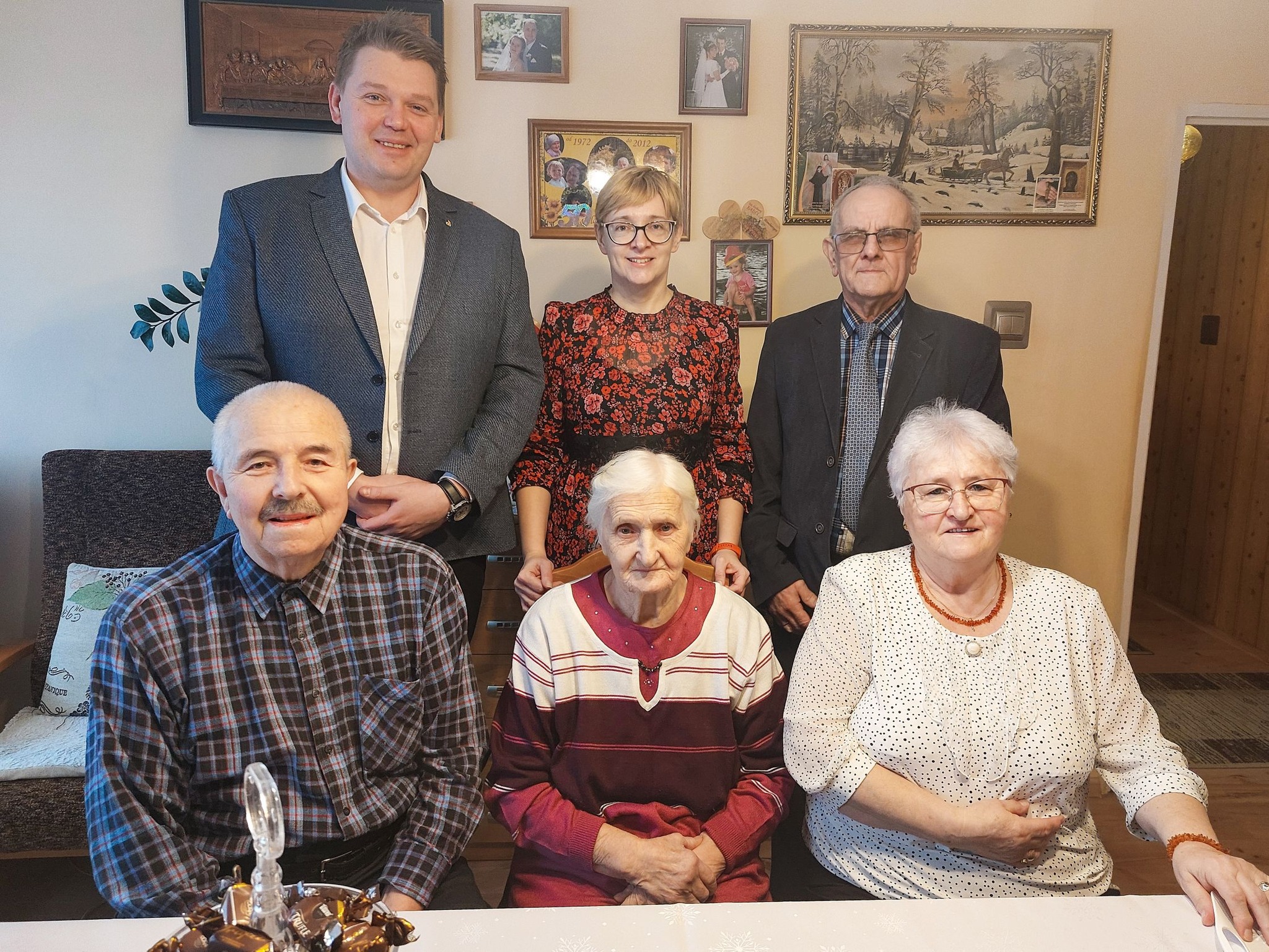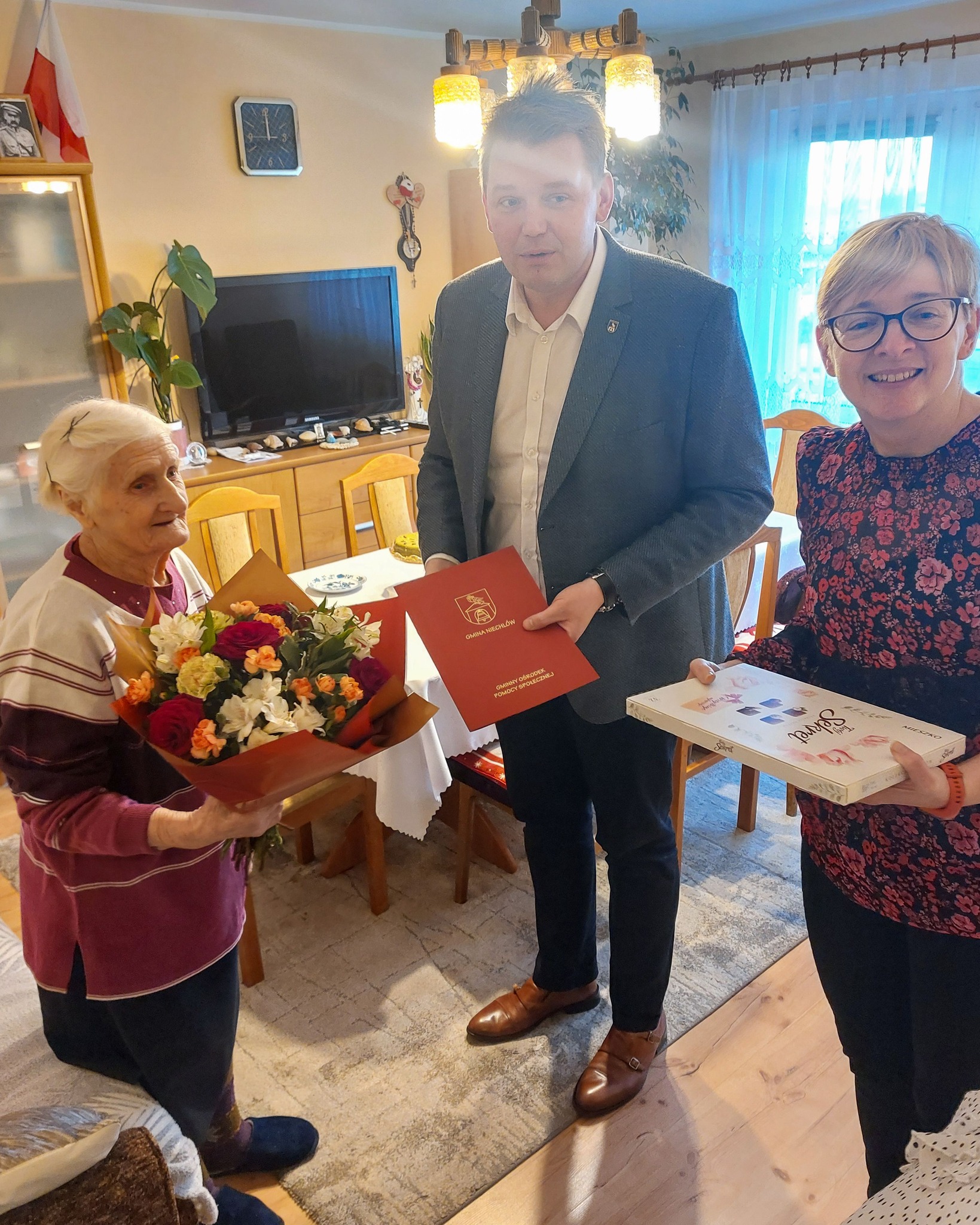 Z tej okazji Jubilatkę odwiedzili: Wójt Karol Czapla, Dyrektor GOPS Alina Strawczyńska oraz Przewodniczący Rady Seniorów Józef Lewczak.