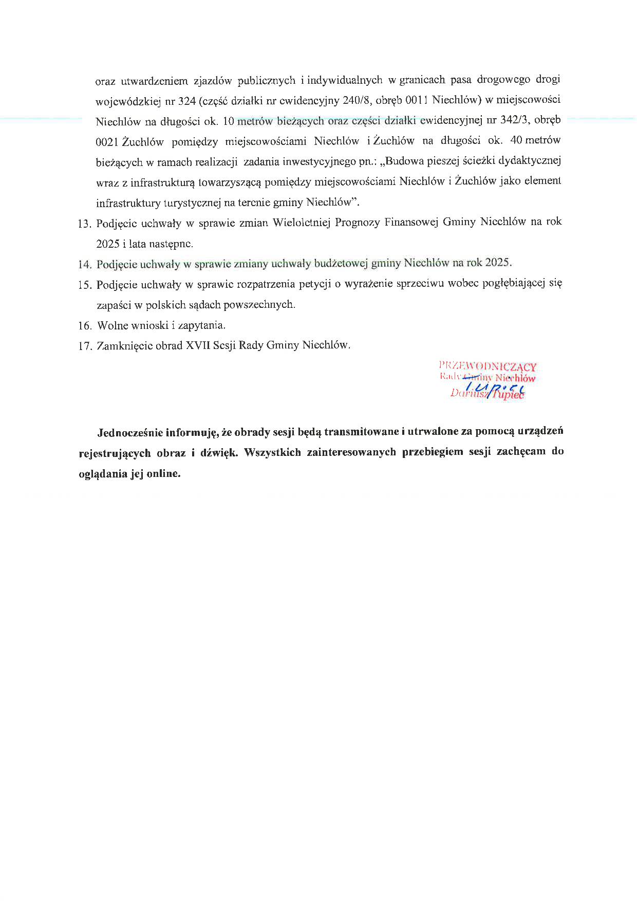 Zawiadomienie o XVII Sesji Rady Gminy Niechlów