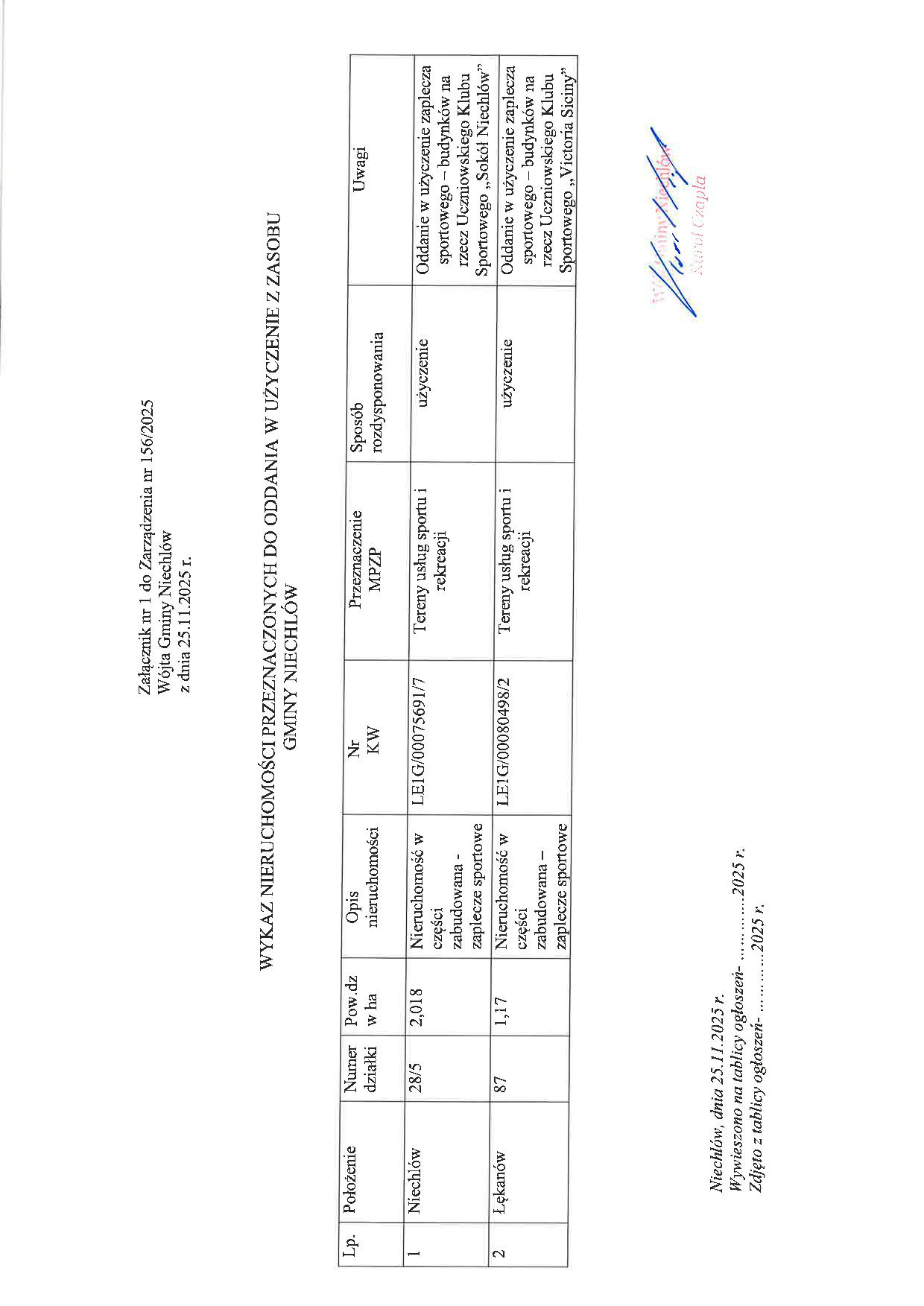 ZARZĄDZENIE NR 156/2025 WÓJTA GMINY NIECHLÓW + WYKAZ NIERUCHOMOŚCI PRZEZNACZONYCH DO ODDANIA W UŻYCZENIE Z ZASOBU GMINY NIECHLÓW