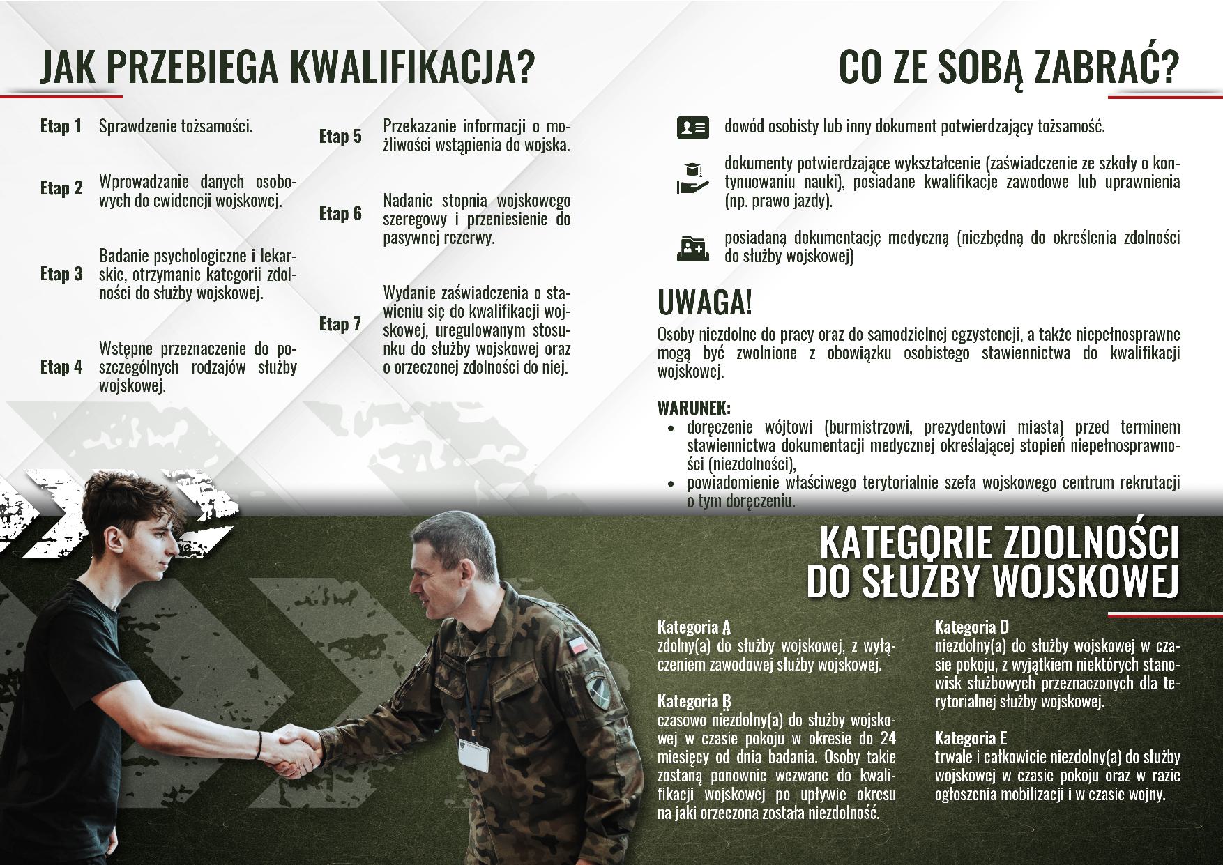 Przypominamy o nadchodzącej kwalifikacji wojskowej. Sprawdź, jak przebiega proces, jakie dokumenty należy zabrać oraz jakie są kategorie zdolności do służby wojskowej. Ulotka zawiera wszystkie niezbędne informacje, od badania lekarskiego po wydanie zaświadczenia.