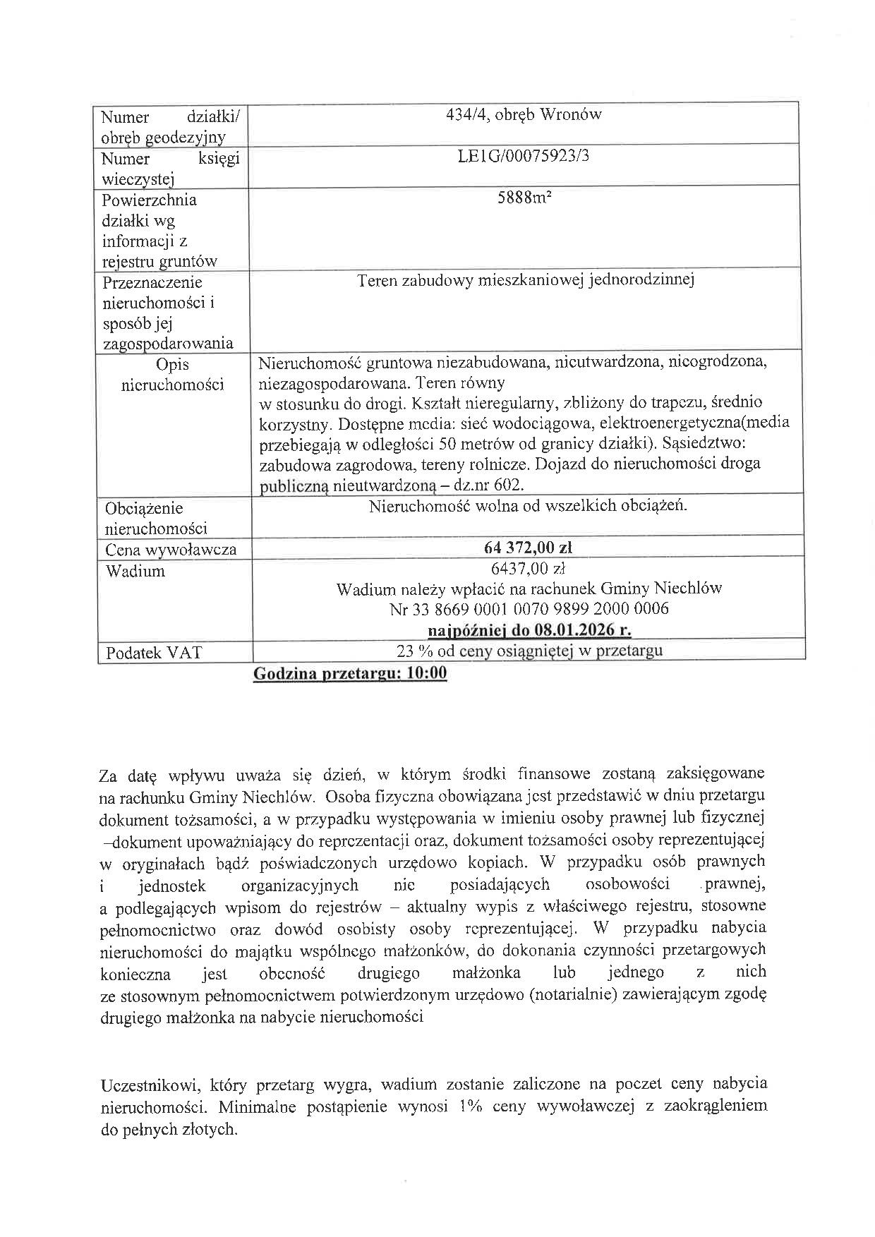 OGŁOSZENIE O PRZETARGU USTNYM NIEOGRANICZONYM NA ZBYCIE NIERUCHOMOŚCI W M. WRONÓW