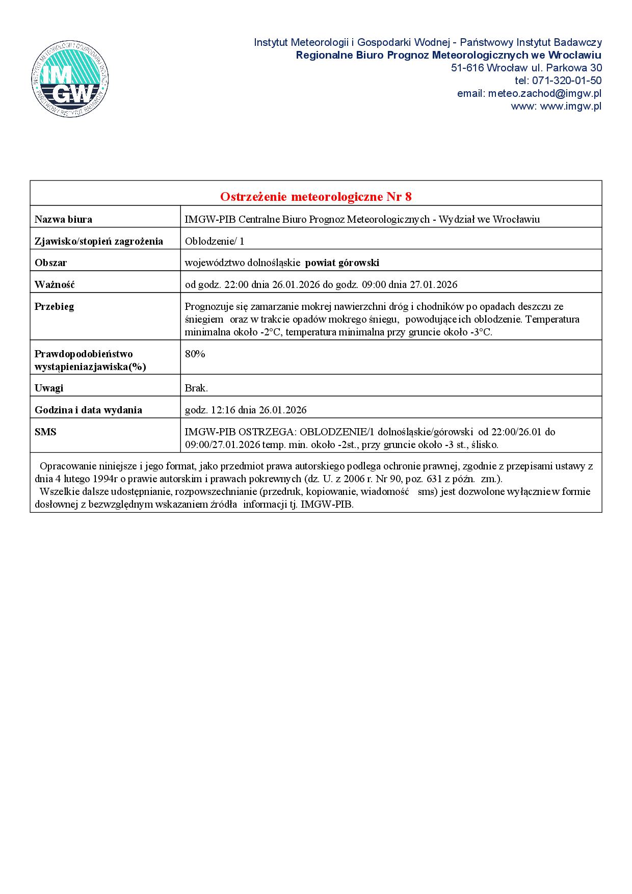 Instytut Meteorologii i Gospodarki Wodnej wydał ostrzeżenie meteorologiczne dla powiatu górowskiego. Informacja dot. prognozowanej zamarzającej nawierzchni dróg i chodników. Prosimy o zachowanie ostrożności oraz zachęcamy do zapoznania się z informacją.