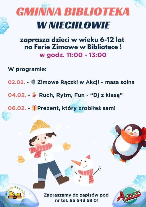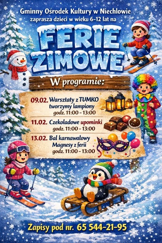 Już niebawem zimowa przerwa świąteczna - dwa tygodnie pełne wyjątkowych aktywności, zorganizowane z myślą o dzieciach i młodzieży z naszej gminy. Gminny Ośrodek Kultury w Niechlowie, Gminna Biblioteka w Niechlowie oraz Filia Biblioteczna w Sicinach przygotowały program pełen różnorodnych zajęć, które sprawią, że ten czas wolny od szkoły będzie niezapomniany!
