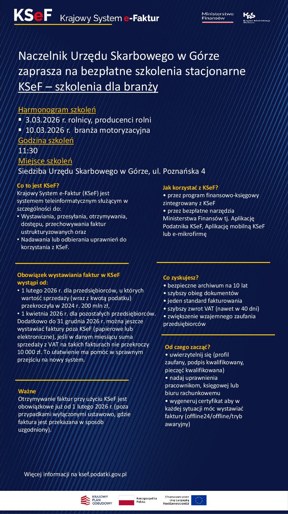 Krajowy System e-Faktur staje się obowiązkowy. Przedsiębiorco, chcesz wiedzieć, jak sprawnie wdrożyć go w swojej firmie? Naczelnik Urzędu Skarbowego w Górze zaprasza na praktyczne szkolenia stacjonarne dedykowane konkretnym branżom!