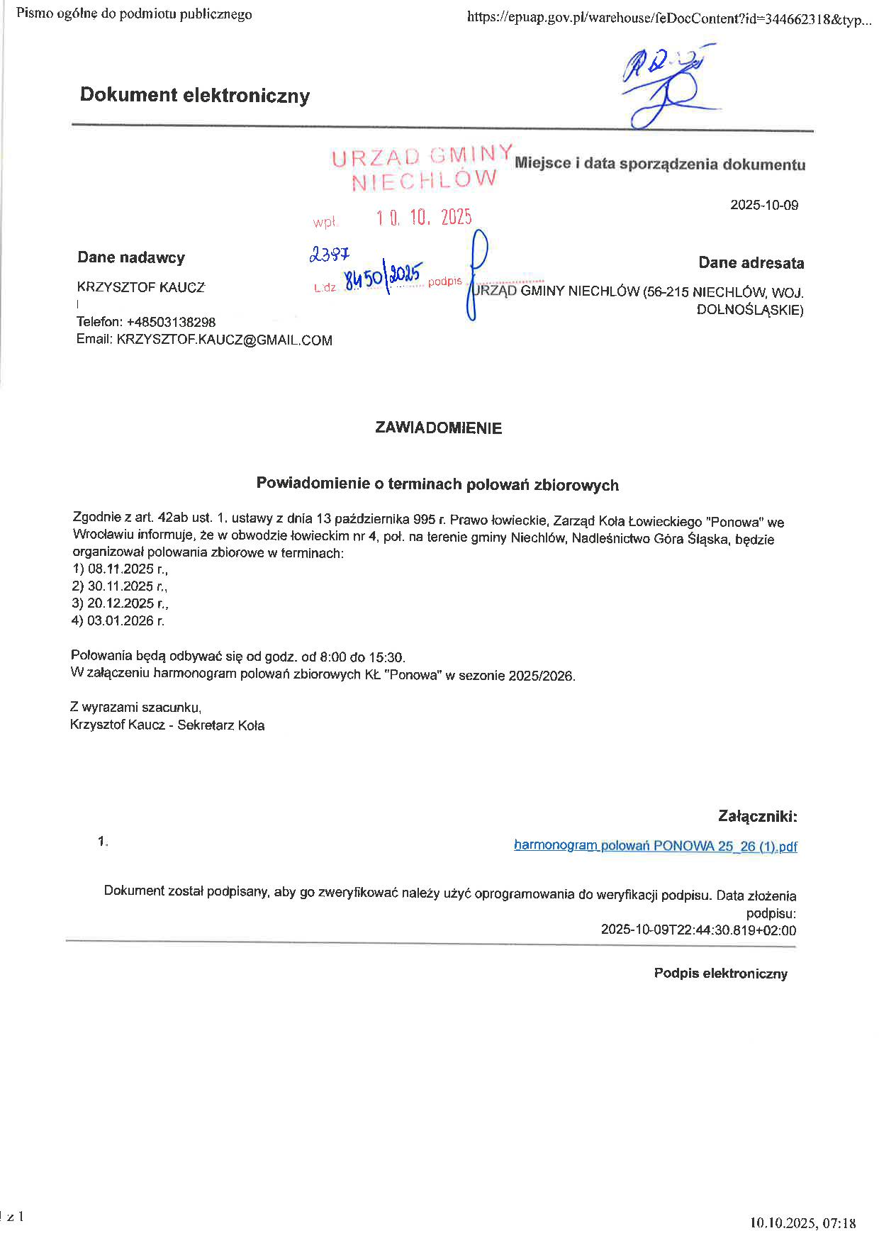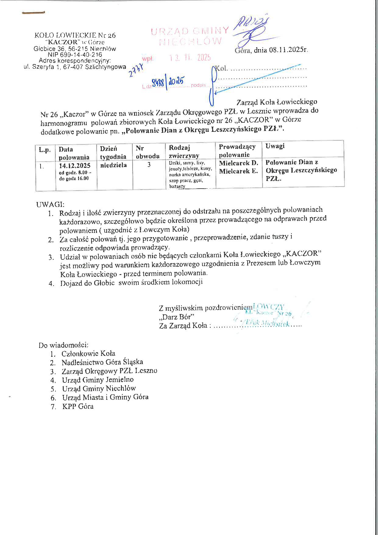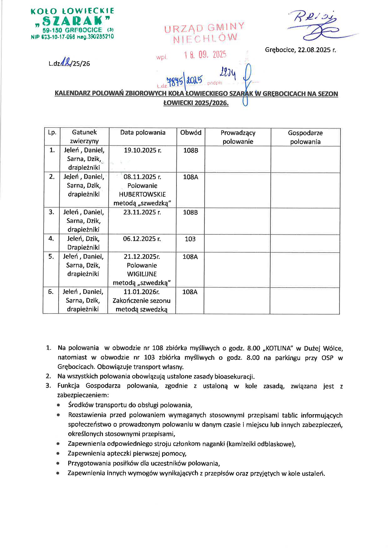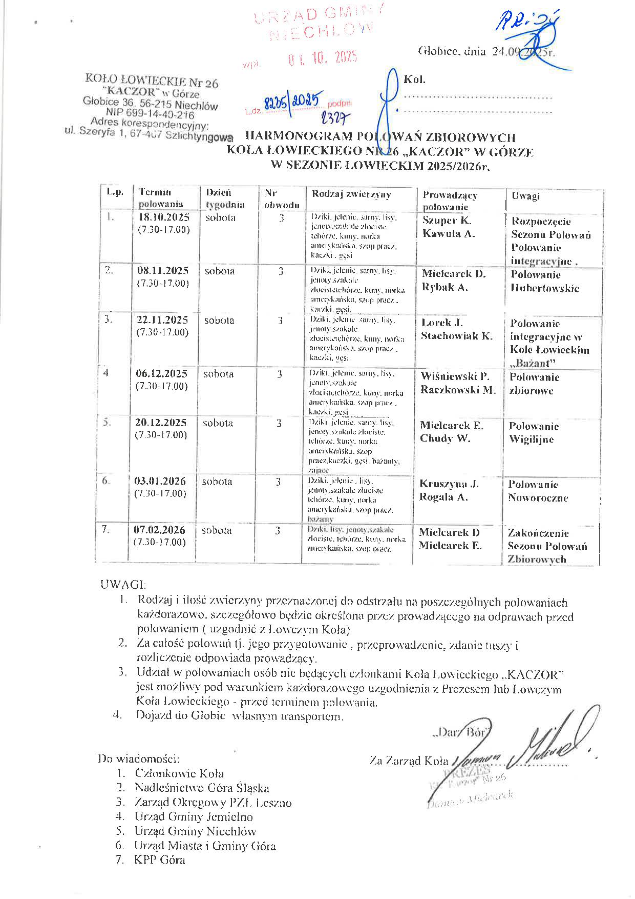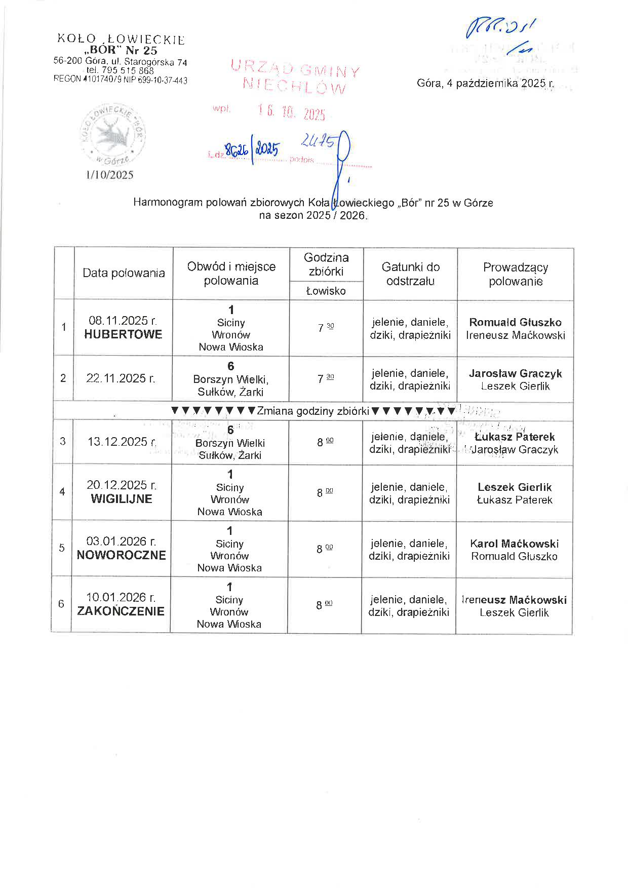 Poniżej znajdują się harmonogramy polowań na sezon 2025/2026 dla poszczególnych kół łowieckich działających na terenie naszej gminy: