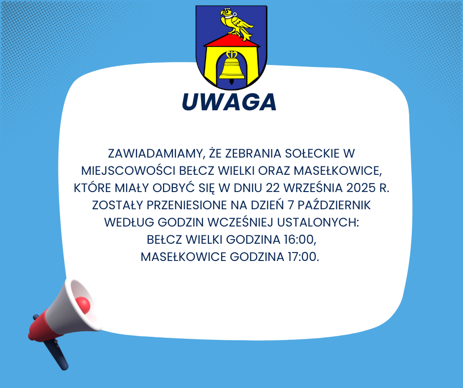 Zawiadamiamy, że zebrania sołeckie w miejscowości Bełcz Wielki oraz Masełkowice, które miały odbyć się w dniu 22 września 2025 r. zostały przeniesione na dzień 7 październik według godzin wcześniej ustalonych:Bełcz wielki godzina 16:00, Masełkowice godzina 17:00.