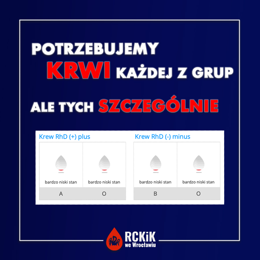 Ze względu na bardzo niskie stany krwi zapraszamy osoby z grupami krwi: A+, O+,B-,O-