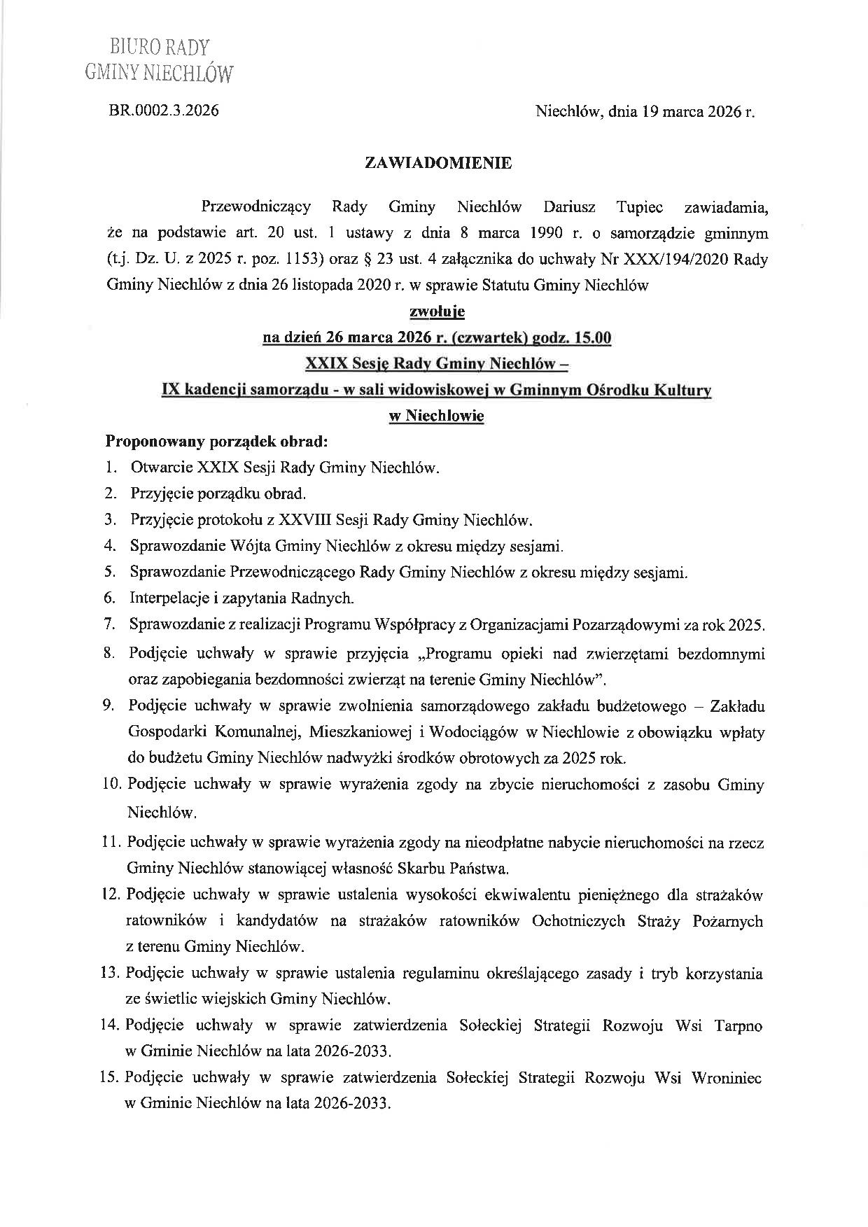 Zakład Gospodarki Komunalnej, Mieszkaniowej i Wodociągów w Niechlowie zawiadamia, iż w związku z awarią sieci wodociągowej w dniu 19.03.2026 r. do godz. 16.00, nastąpi wyłączenie dostaw wody do nieruchomości w miejscowości Żuchlów, Niechlów i Klimontów.