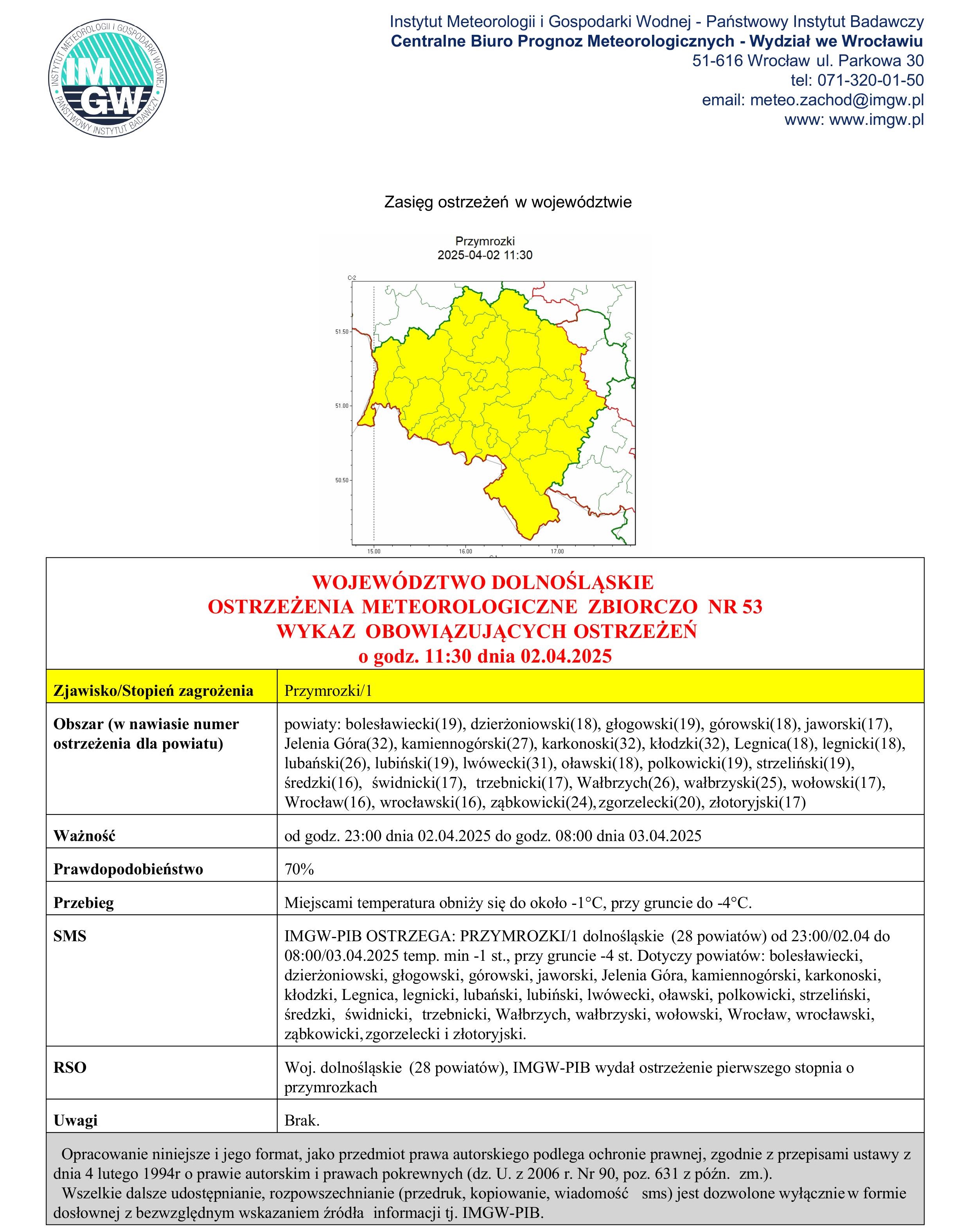 Instytut Meteorologii i Gospodarki Wodnej wydał ostrzeżenie pierwszego stopnia dotyczące przymrozków dla województwa dolnośląskiego, w tym powiatu górowskiego.