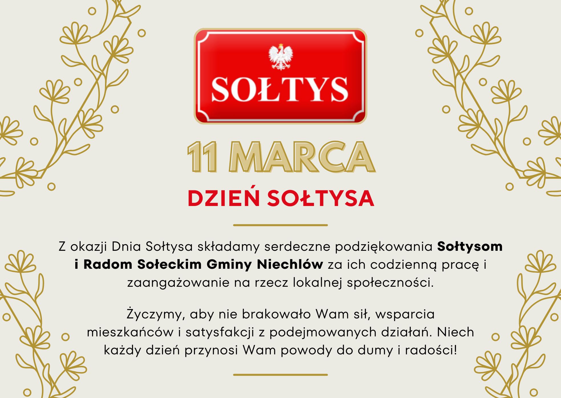 Z okazji przypadającego dziś Dnia Sołtysa, składamy serdeczne podziękowania wszystkim Sołtysom i Radom Sołeckim Gminy Niechlów za codzienną pracę, zaangażowanie i troskę o nasze lokalne społeczności.