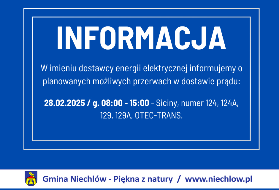 W imieniu dostawcy energii elektrycznej informujemy o planowanych możliwych przerwach w dostawie prądu w dn. 28.02.2025.