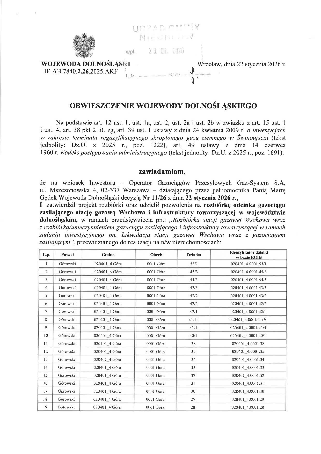 W sprawie zatwierdzenie projektu rozbiórki oraz udzielenia pozwolenia na rozbiórkę odcinka gazociągu zasilającego stację gazową Wschowa i infrastruktury towarzyszącej w województwie dolnośląskim, przewidzianego do realizacji na n/w nieruchomościach (w Gminie Niechlów dotyczy m. Tarpno, Siciny). Poniżej cała treść obwieszczenia:
