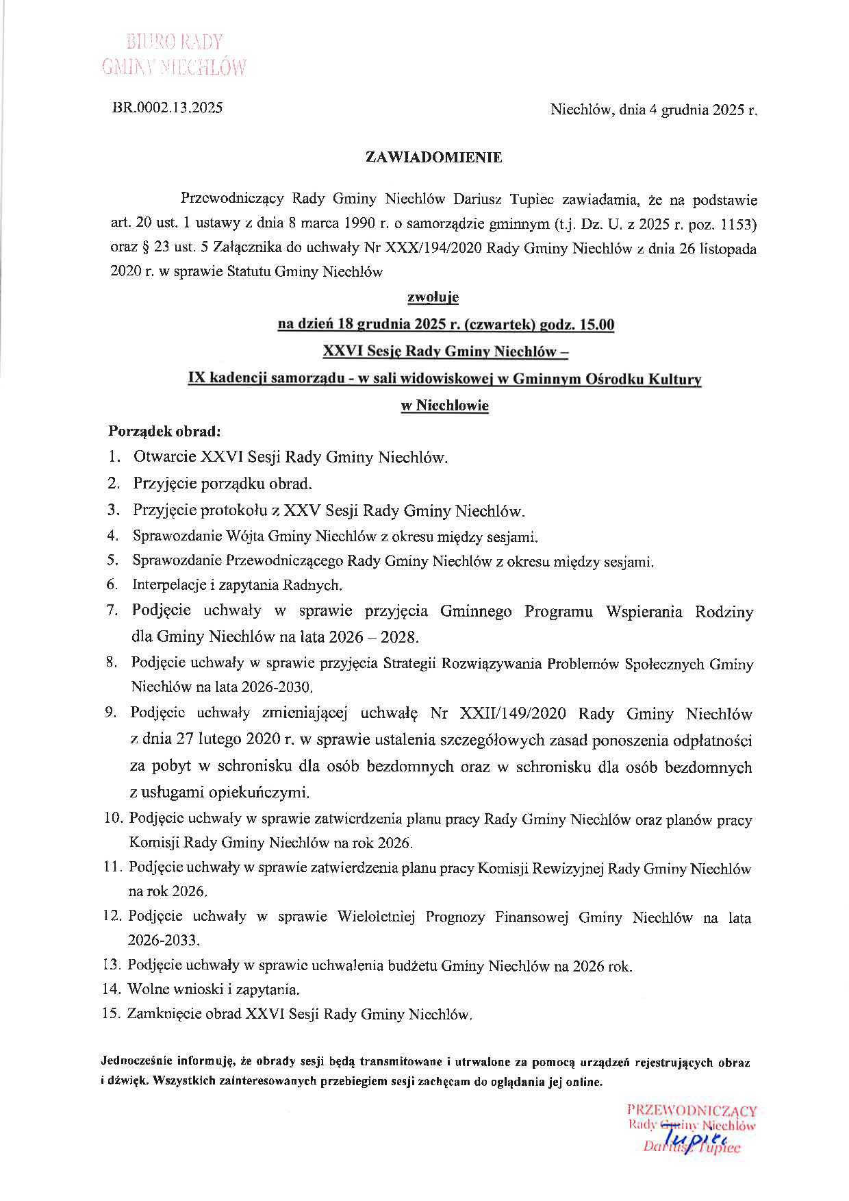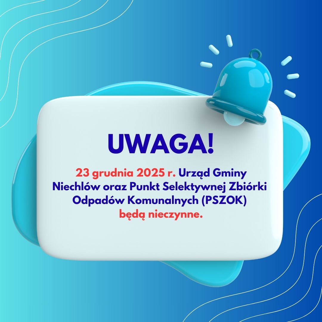 📢 Uprzejmie informujemy, że w dniu 23 grudnia 2025 r. Urząd Gminy Niechlów oraz Punkt Selektywnej Zbiórki Odpadów Komunalnych (PSZOK) będzie nieczynny z uwagi na dzień wolny za 01.11.2025 r. Za utrudnienia przepraszamy.