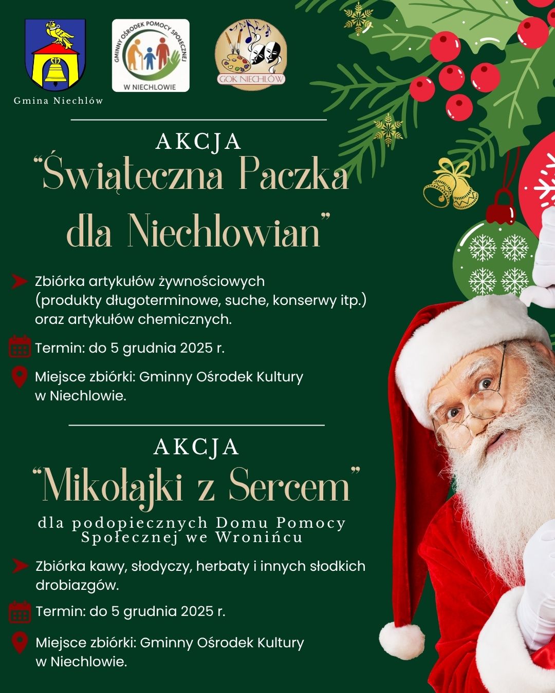 🎄🎁 Zbliżający się czas Bożego Narodzenia to doskonała okazja, by okazać wsparcie tym, którzy najbardziej go potrzebują. Urząd Gminy Niechlów oraz Gminny Ośrodek Pomocy Społecznej w Niechlowie, we współpracy z Gminnym Ośrodkiem Kultury w Niechlowie, zapraszają mieszkańców oraz chętne osoby do udziału w dwóch świątecznych akcjach: