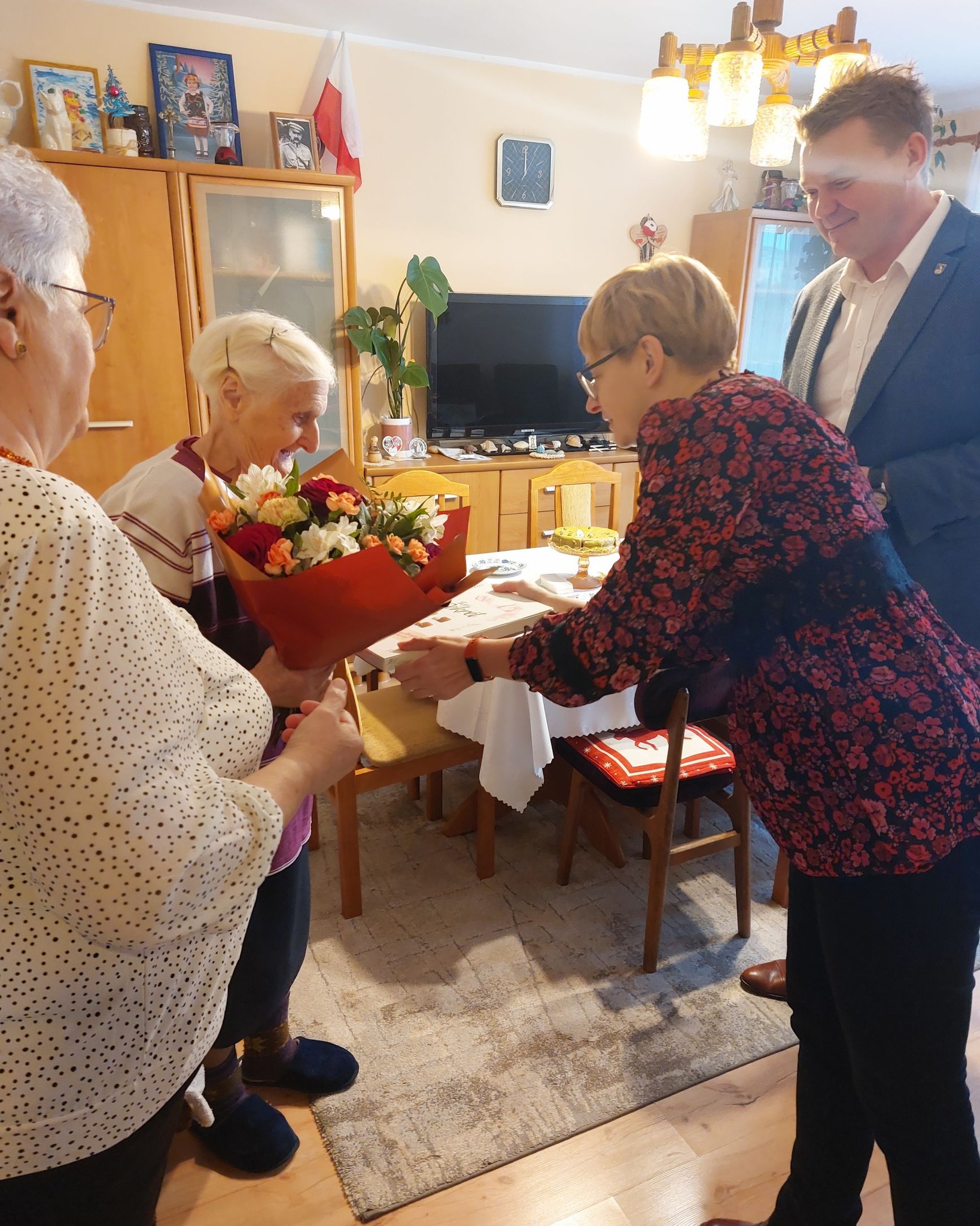 Z tej okazji Jubilatkę odwiedzili: Wójt Karol Czapla, Dyrektor GOPS Alina Strawczyńska oraz Przewodniczący Rady Seniorów Józef Lewczak.