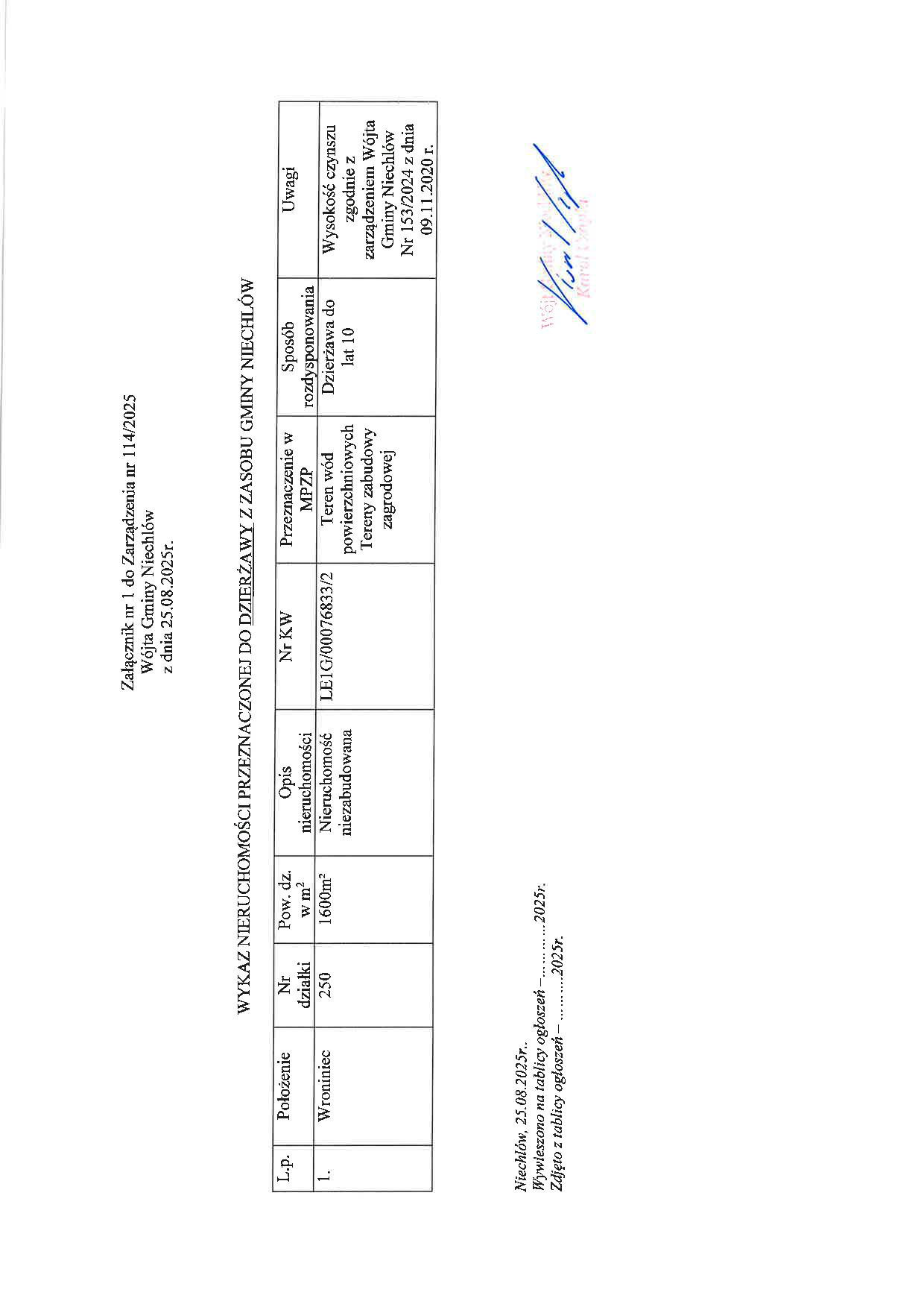 ZARZĄDZENIE NR 114/2025 WÓJTA GMINY NIECHLÓW Z DNIA 25.08.2025R. W SPRAWIE OGŁOSZENIA WYKAZU NIERUCHOMOŚCI PRZEZNACZONEJ DO DZIERŻAWY DO LAT 10