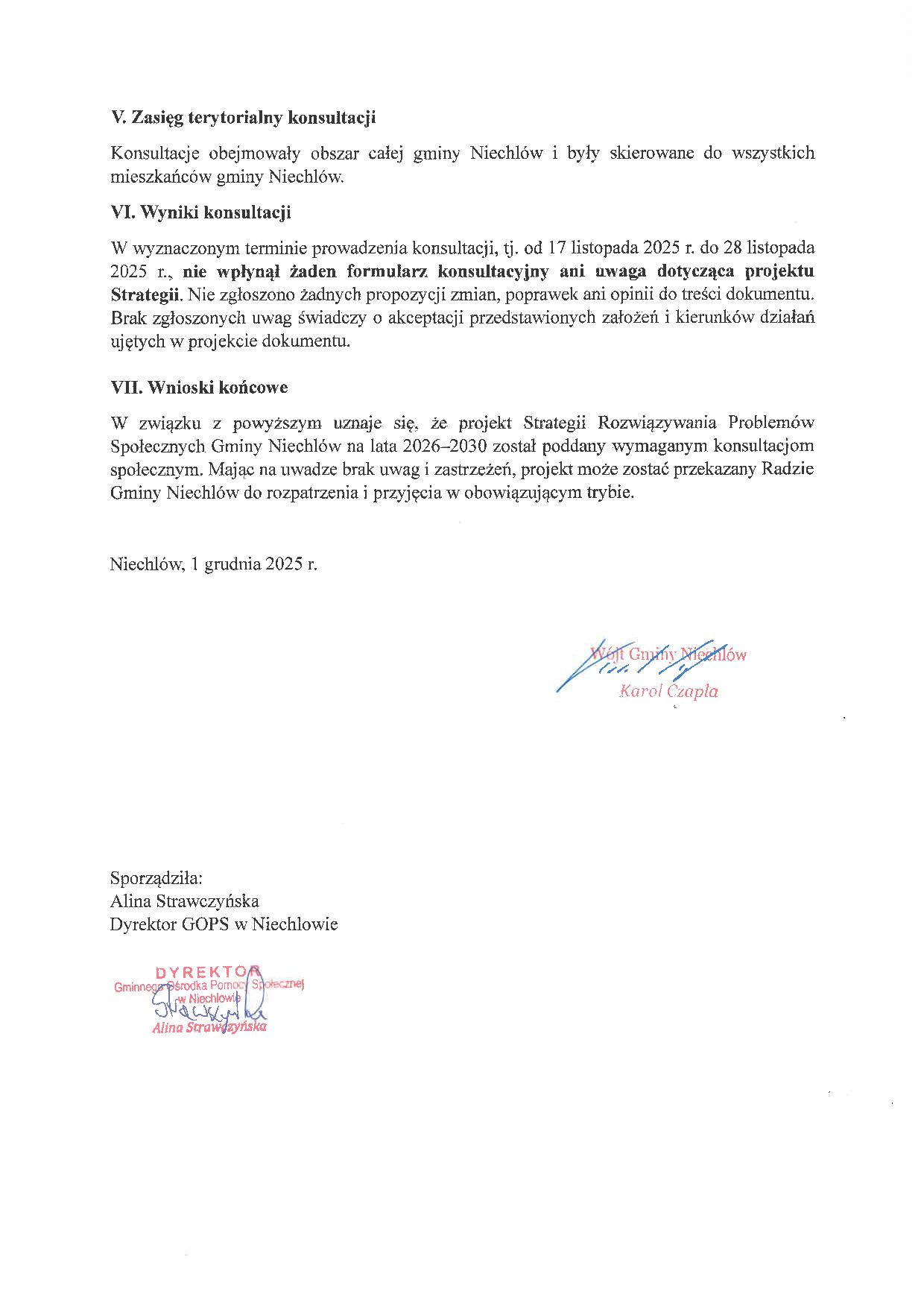 PROTOKÓŁ Z PRZEBIEGU KONSULTACJI SPOŁECZNYCH DOTYCZĄCYCH PROJEKTU STRATEGII ROZWIĄZYWANIA PROBLEMÓW SPOŁECZNYCH GMINY NIECHLÓW NA LATA 2026-2030