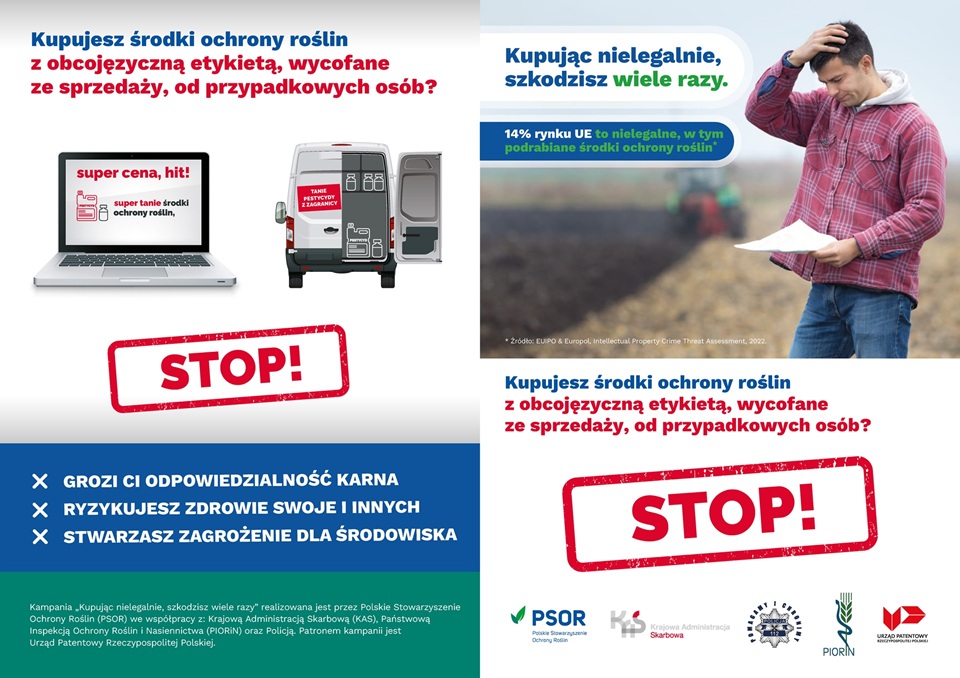 Nielegalne, w tym podrobione środki ochrony roślin, pozostają jednym z najpoważniejszych zagrożeń dla bezpieczeństwa żywności, zdrowia ludzi, zwierząt i środowiska, ale także są ryzykiem dla uczciwej konkurencji w sektorze rolno-spożywczym. Właśnie dlatego ruszyła 8. edycja ogólnopolskiej kampanii edukacyjnej „Kupując nielegalnie, szkodzisz wiele razy”. Jej celem jest zmniejszenie ilości zakupu i stosowania nielegalnych, w tym podrobionych środków ochrony roślin oraz podnoszenie świadomości rolników na temat ryzyk zdrowotnych, środowiskowych, prawnych i ekonomicznych wynikających z ich stosowania. Kampanię realizują wspólnie: Polskie Stowarzyszenie Ochrony Roślin (PSOR), Krajowa Administracja Skarbowa (KAS), Państwowa Inspekcja Ochrony Roślin i Nasiennictwa (PIORiN) oraz Policja, pod patronatem Urzędu Patentowego RP.
