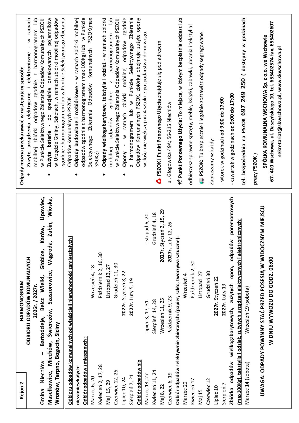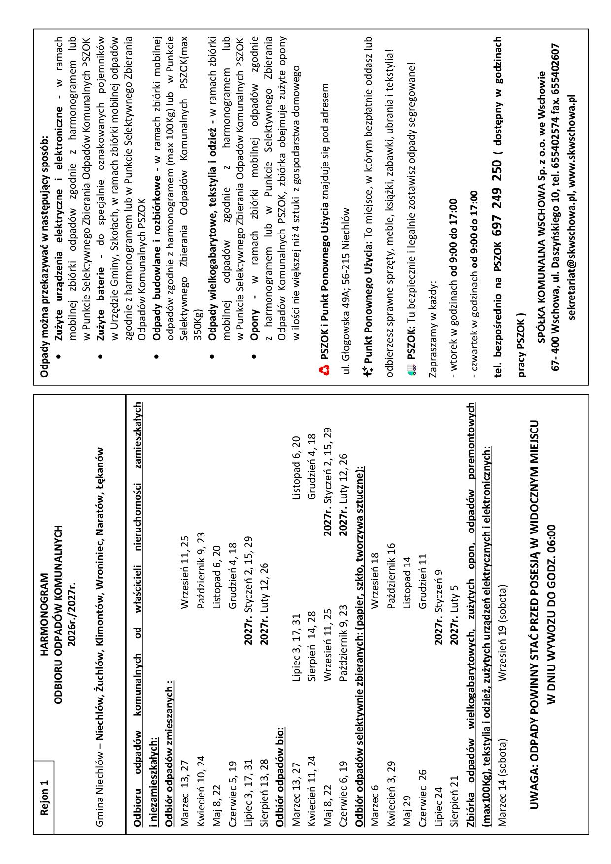 HARMONOGRAM ODBIORU ODPADÓW KOMUNALNYCH 2026 r. / 2027 r. - Niechlów, Żuchlów, Klimontów, Wroniniec, Naratów, Łękanów