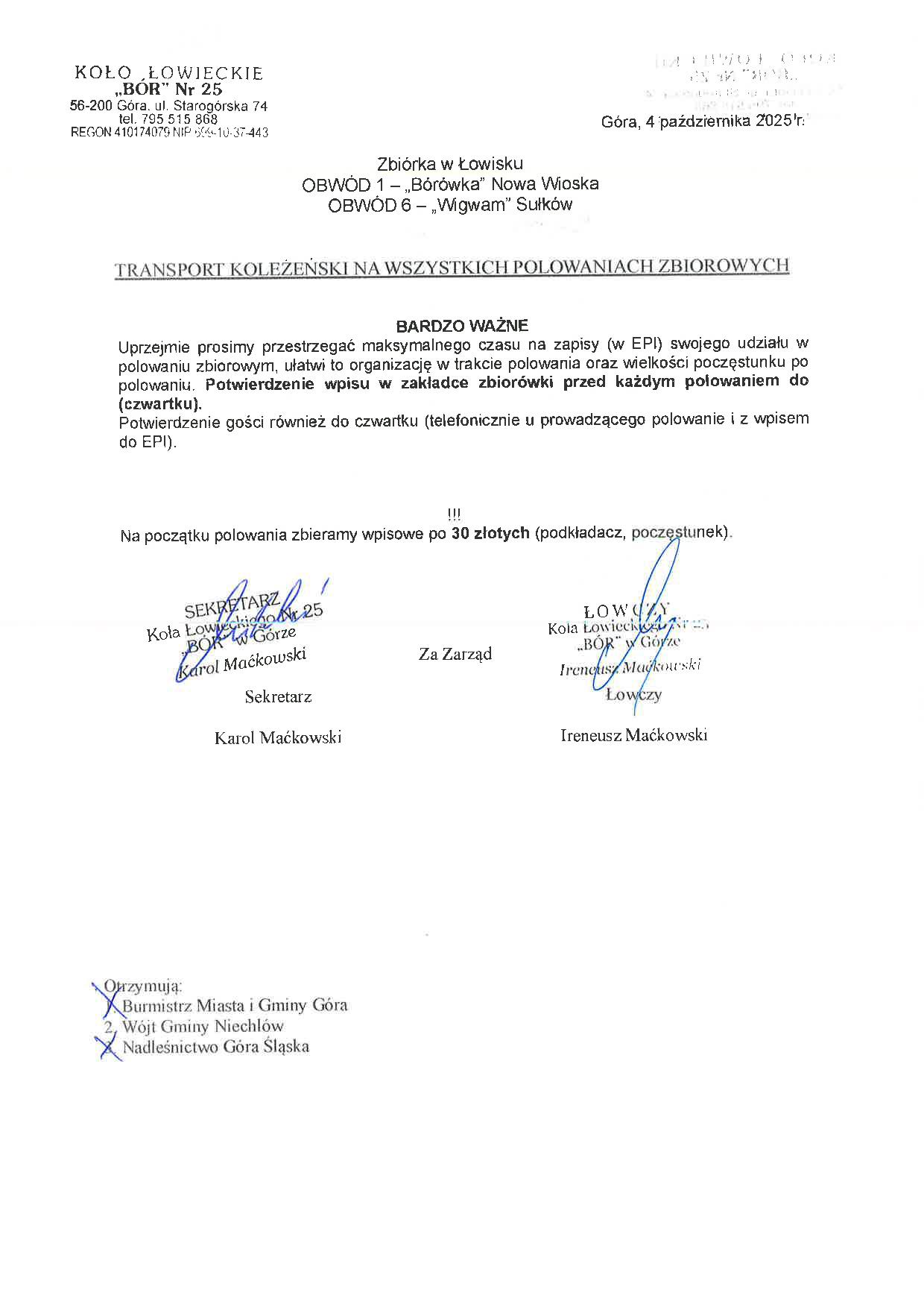 Prosimy o zachowanie szczególnej ostrożności w wyznaczonych dniach polowań oraz o ścisłe przestrzeganie zasad bezpieczeństwa. Informacje te są szczególnie ważne dla osób korzystających z terenów leśnych w celach rekreacyjnych, takich jak spacery czy grzybobranie.
