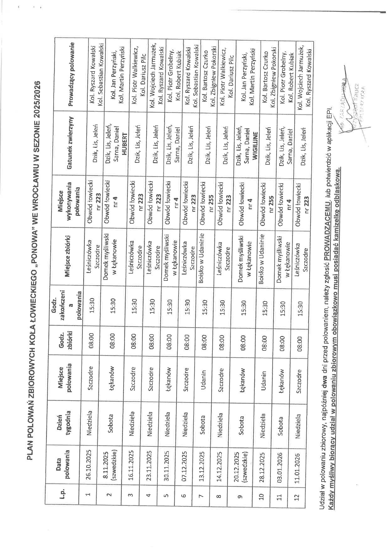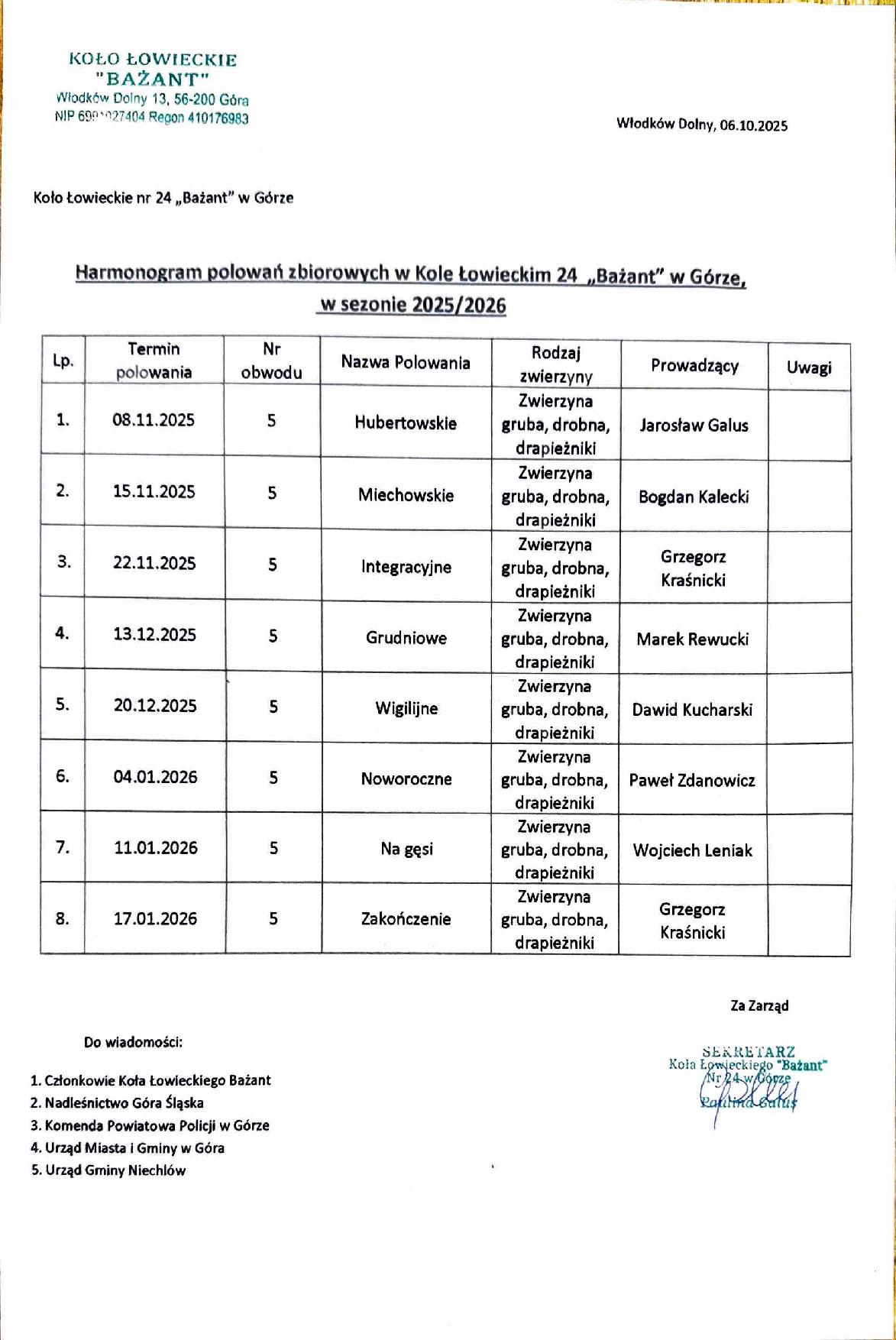 Poniżej znajdują się harmonogramy polowań na sezon 2025/2026 dla poszczególnych kół łowieckich działających na terenie naszej gminy: