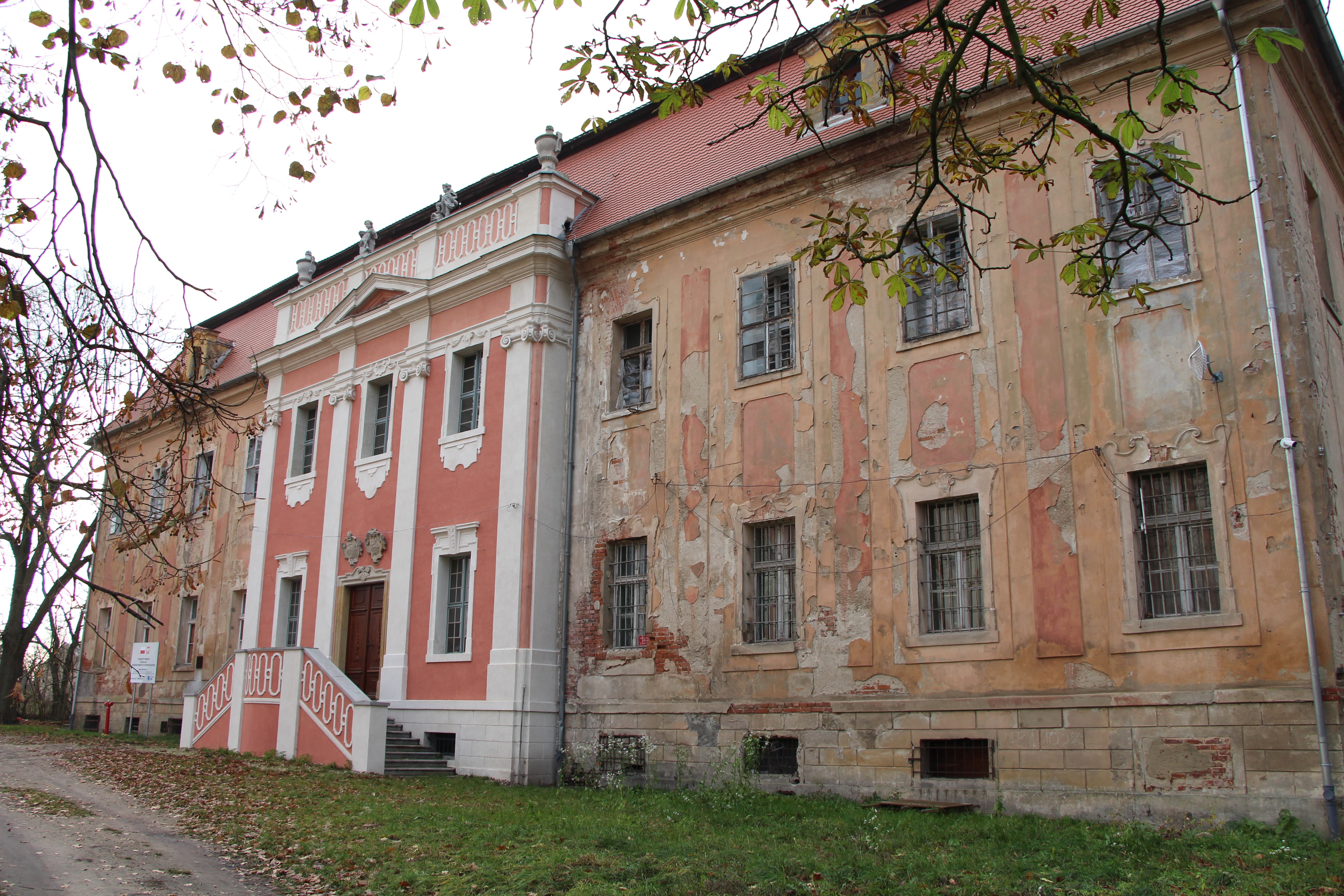 Budynek robi wrażenie. Jest świadectwem niegdysiejszej świetności wsi. Pałac, a właściwie klasztor wybudowali w 1740 roku cystersi. Powstał według projektu sławnego Karla Frantza. Murowany, założony na prostokącie, trzytraktowy, dwukondygnacjowy z płytkimi ryzalitami akcentowanymi podziałem pilastrowym. Zachował w sali na piętrze freski warsztatu Bentuma przedstawiające scenę fundacji przez księcia Henryka II kościoła i pałacu. Stoi tuż obok kościoła. Przez lata obiekt był niemym świadkiem historii, często bardzo dramatycznej. Pracowici mnisi mieszkali w nim do 1810 roku, kiedy to śląskie klasztory zostały zsekularyzowane i skonfiskowane przez państwo pruskie. Następnie otrzymała go pruska księżna Henriette d?Oultremont de Wegimont jako podziękowanie za noc poślubną z Wilhelmem I, późniejszym królem Niderlandów. Do wojny zajmował go właściciel ziemski, który gospodarzył na poklasztornych ziemiach. Pałacowi udało się uniknąć zniszczenia i przetrwać wojenną zawieruchę a wojska radzickie stacjonowały tu krótko. Powojenne lata także obeszły się z nim łaskawie. Najprawdopodobniej stało się tak, bo obiekt przeznaczono na cele oświatowe i publiczne. Swoją siedzibę miała tu m.in. gromadzka rada narodowa, urząd stanu cywilnego, bank, ośrodek zdrowia, milicja, szkoła, a także biblioteka, które działa w nim do dziś.