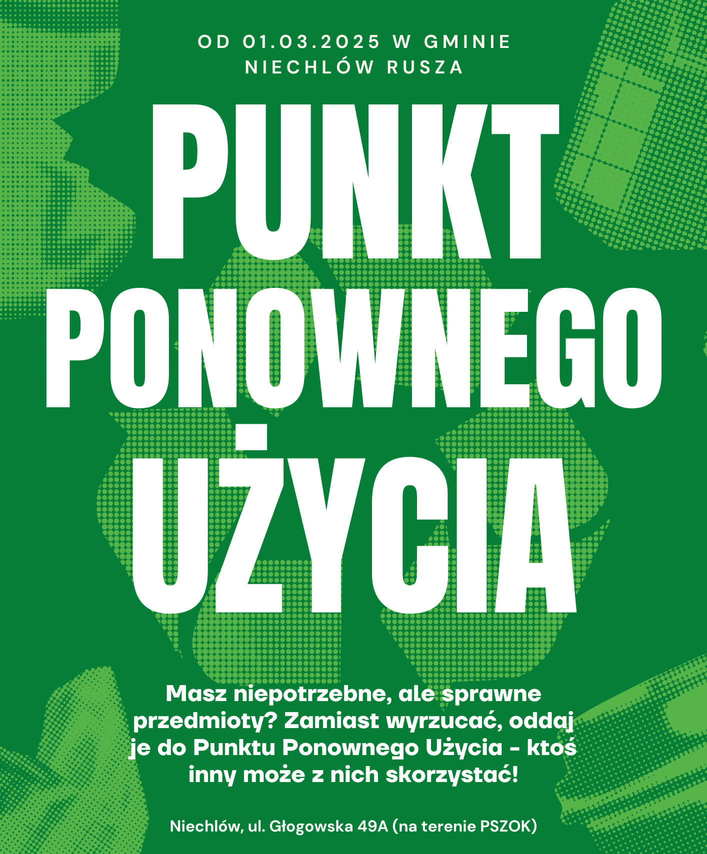 Produkty nie będące odpadami z Punktu ponownego użycia, mogą być nieodpłatnie przekazane osobom zainteresowanym w godzinach funkcjonowania PSZOK. Ponowne użycie nie jest tylko sposobem na oszczędność, ale przede wszystkim na dbanie o środowisko. Zatrważająca jest ilość śmieci, jakie produkujemy w naszych gospodarstwach domowych. Sposobem na ograniczenie ilości odpadów jest właśnie ponowne użycie przedmiotów i to za darmo. Dzięki tym działaniom niechciane przedmioty mają szansę znaleźć nowego właściciela, zamiast stać się odpadem!