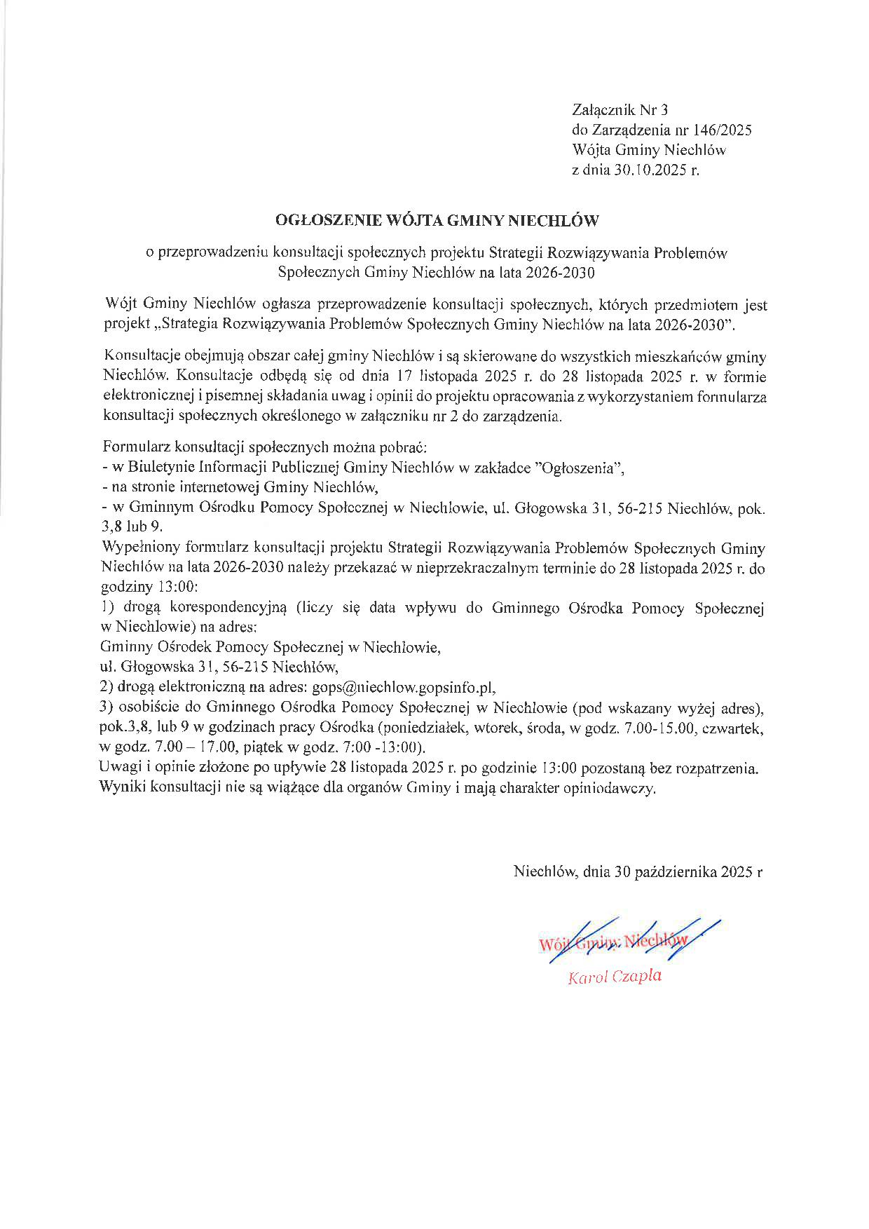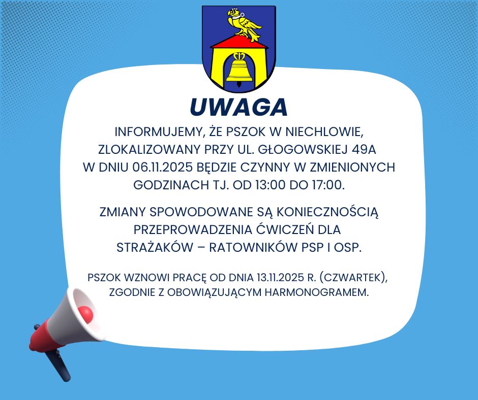 📢 Szanowni Mieszkańcy, uprzejmie informujemy, że PSZOK w Niechlowie, zlokalizowany przy ul. Głogowskiej 49A w dniu 06.11.2025 będzie czynny w zmienionych godzinach tj. od 13:00 do 17:00.