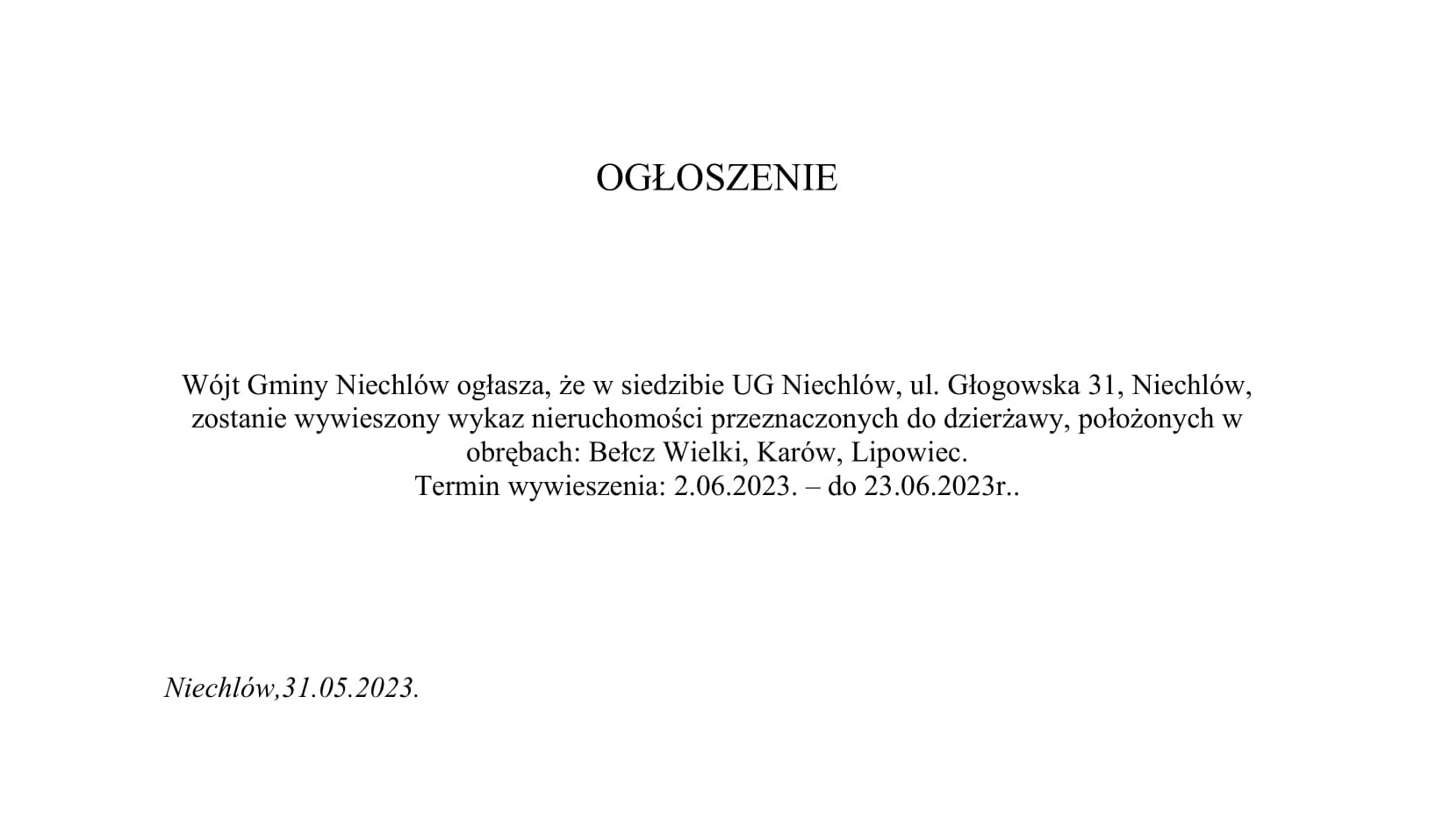 Realizując obowiązek wynikający z art. 28aa ustawy z dnia 8 marca 1990 r. o samorządzie gminnym przygotowany został Raport o stanie Gminy Niechlów za 2022 rok. Raport zawiera podsumowanie działalności wójta w roku poprzednim, w szczególności realizację polityk, programów i strategii, uchwał rady gminy oraz informacje określone w Uchwale nr XIX/133/2019 Rady Gminy Niechlów z dnia 19 grudnia 2019 r. w sprawie określenia szczegółowych wymogów raportu o stanie gminy. Zgodnie z art. 28aa ww. ustawy Rada rozpatruje raport podczas sesji, na której podejmowana jest uchwała rady gminy