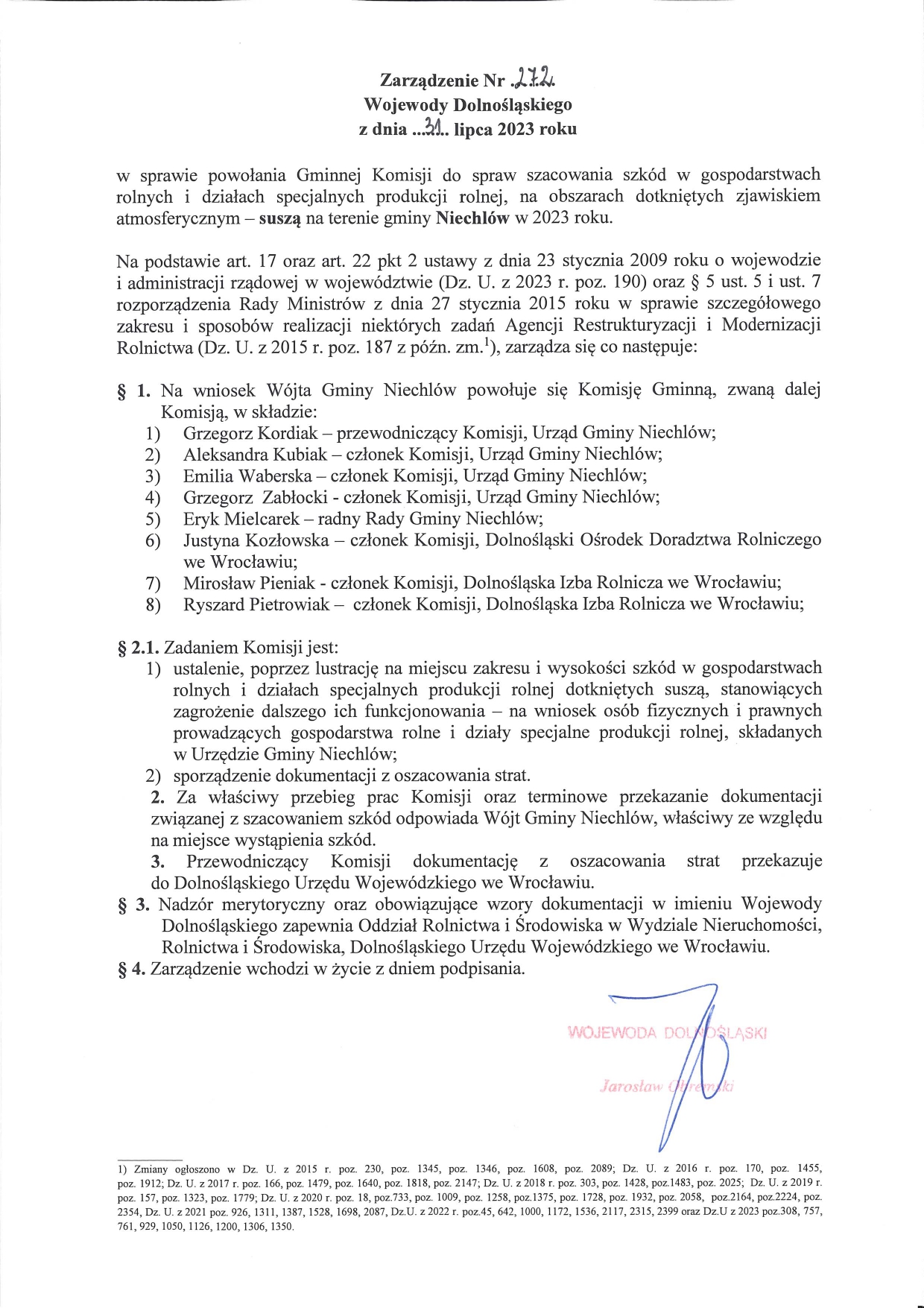 Wójt Gminy Niechlów informuje, że weszły w życie przepisy Rozporządzenia Rady Ministrów z dnia 13 lipca 2023 r. (Dz.U. poz. 1350) , zgodnie z którym Wójt Gminy Niechlów wystąpił do Wojewody o powołanie Komisji Gminnej ds. szacowania szkód powstałych w wyniku suszy. Zarządzeniem nr 272 Wojewody Dolnośląskiego z dnia 31 lipca 2023 r. została powołana Gminna Komisja do spraw szacowania szkód w gospodarstwach rolnych i działach specjalnej produkcji roślinnej, na obszarach dotkniętych zjawiskiem atmosferycznym - suszą na terenie gminy Niechlów w 2023 r.