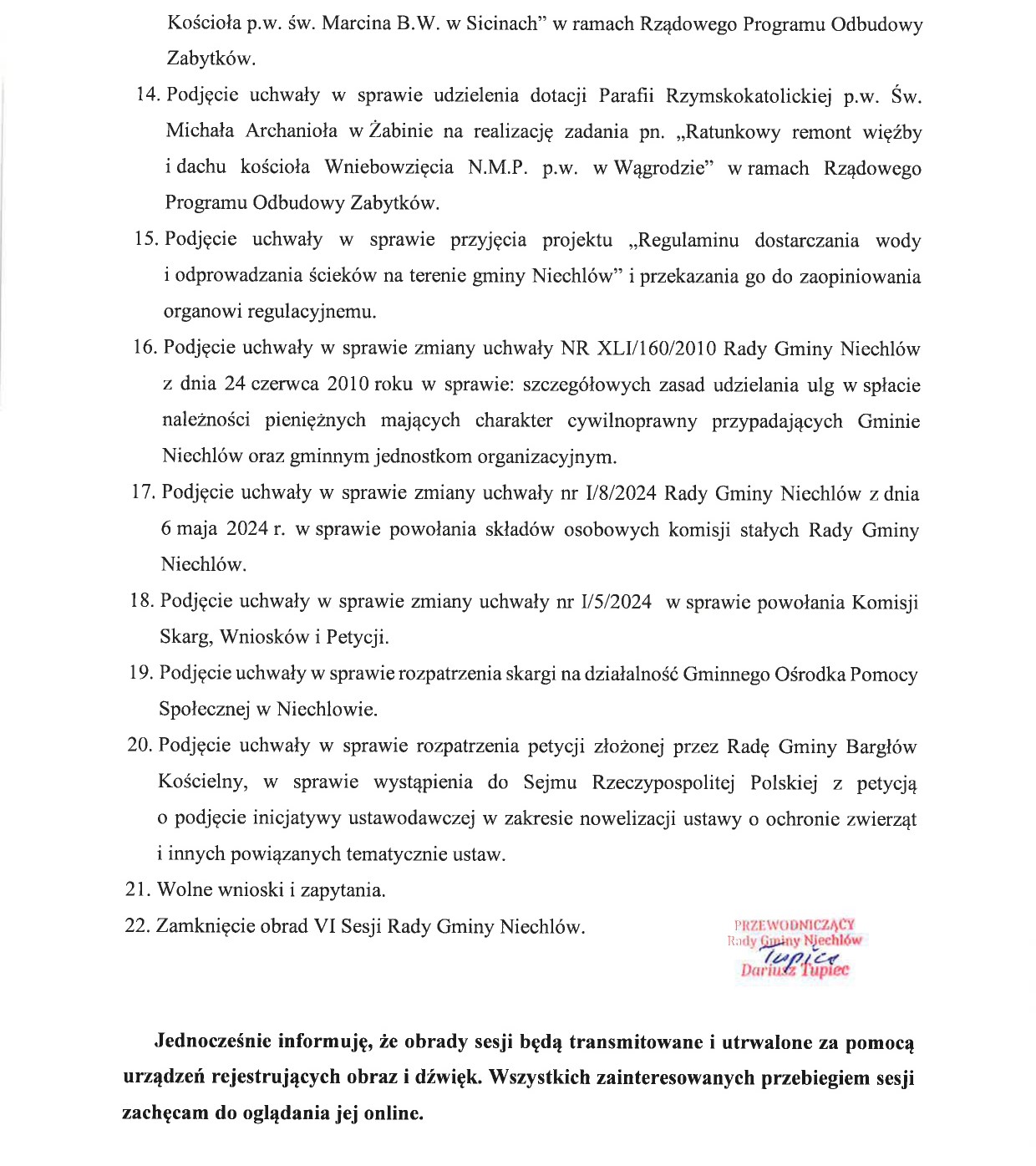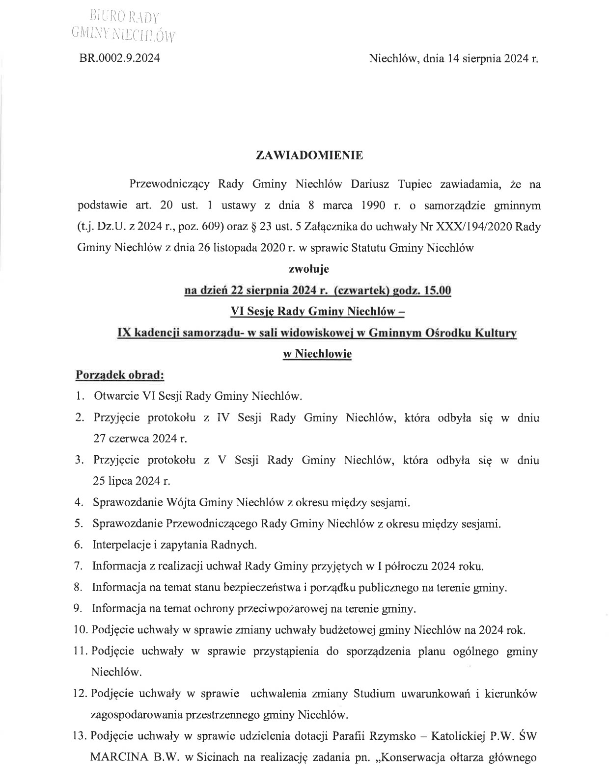 Zakład Gospodarki Komunalnej, Mieszkaniowej i Wodociągów w Niechlowie zawiadamia, iż w związku z awarią sieci wodociągowej w miejscowości Żuchlów, w dniu 09.08.2024 r. w godz. od 9:00 do 15:00 nastąpi czasowe wyłączenie dopływu wody do nieruchomości w miejscowościach Żuchlów, Niechlów i Klimontów. Powyższe spowodowane jest koniecznością wykonania niezbędnych prac związanych z usunięciem awarii. Za zakłócenia w dostawie wody ZGKMiW przeprasza odbiorców usług. Prosimy o zgromadzenie sobie zapasów wody do celów socjalno-bytowych. Jednocześnie zaznaczamy, że wykonanie niezbędnych prac spowodować może chwilowe pogorszenie jakości wody.