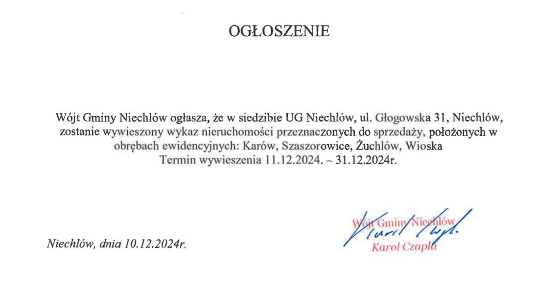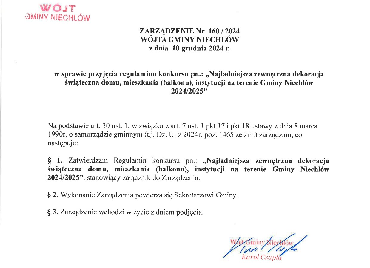 Zarządzenie nr 160/2024 Wójta Gminy Niechlów w sprawie przyjęcia regulaminu konkursu pn.: „Najładniejsza zewnętrzna dekoracja świąteczna domu, mieszkania (balkonu), instytucji na terenie Gminy Niechlów 2024/2025”