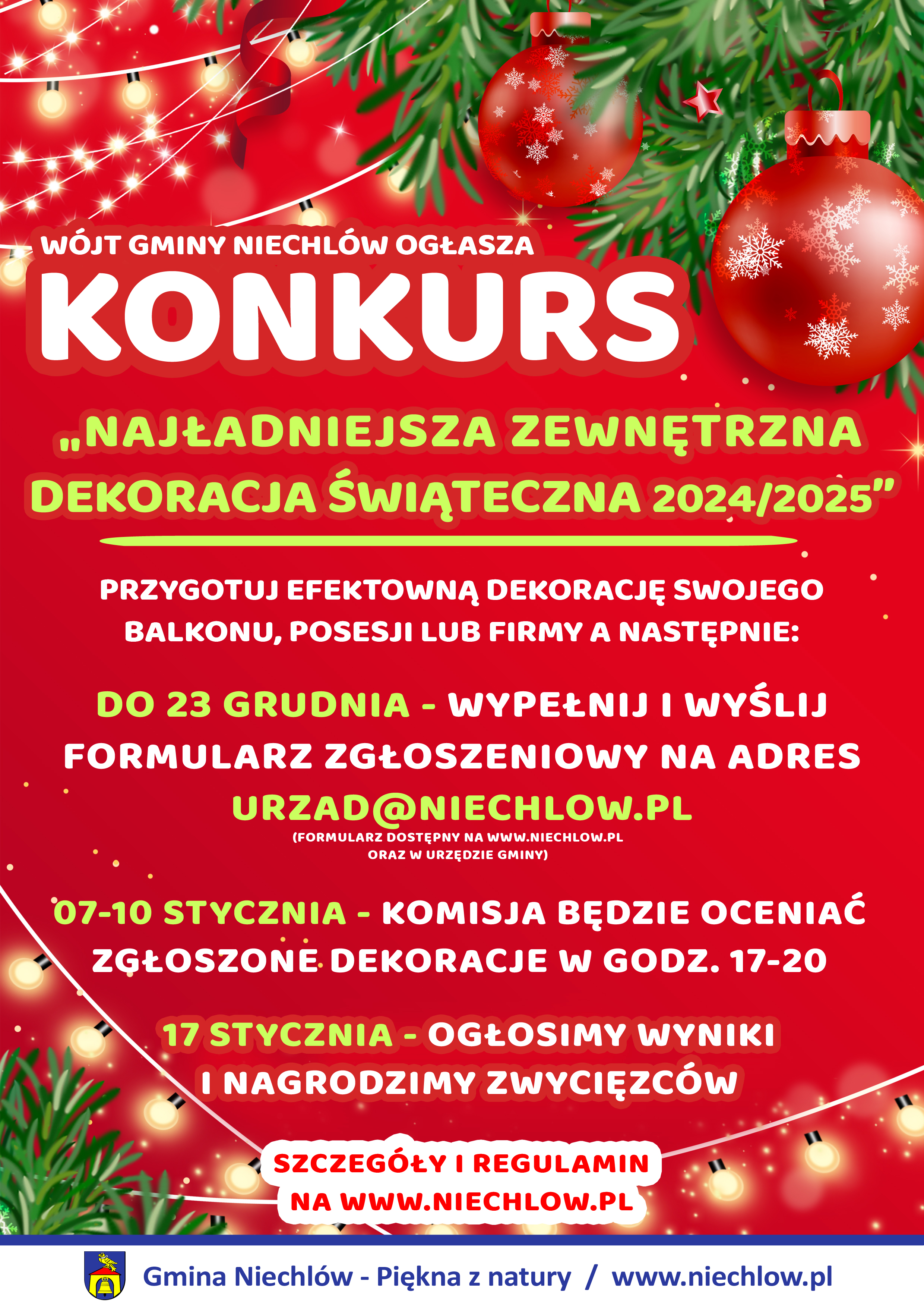 Wójt Gminy Niechlów ogłasza wyjątkowy konkurs na Najładniejszą zewnętrzną dekorację świąteczną 2024/2025! Czy Twój dom, balkon, firma lub instytucja potrafią efektowinie rozświetlić zimowe wieczory i nadać okolicy świątecznej magii? Zaprezentuj to i zgarnij atrakcyjne nagrody!