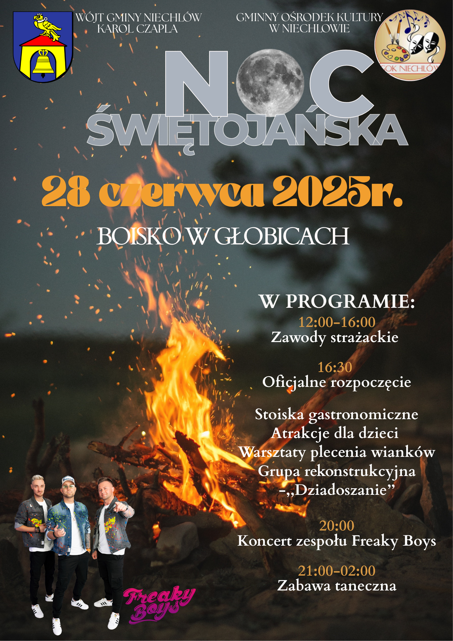 W PROGRAMIE: 12:00–16:00 – Ekscytujące zawody strażackie 16:30 – Uroczyste rozpoczęcie wydarzenia Stoiska gastronomiczne – pyszne smaki dla każdego Atrakcje dla dzieci – radość i zabawa dla najmłodszych Warsztaty plecenia wianków – odkryj magię tradycji Grupa rekonstrukcyjna "Dziadoszanie" – historia ożywa na Waszych oczach 20:00 – Koncert zespołu Freaky Boys 21:00–02:00 – Zabawa taneczna pod gwiazdami