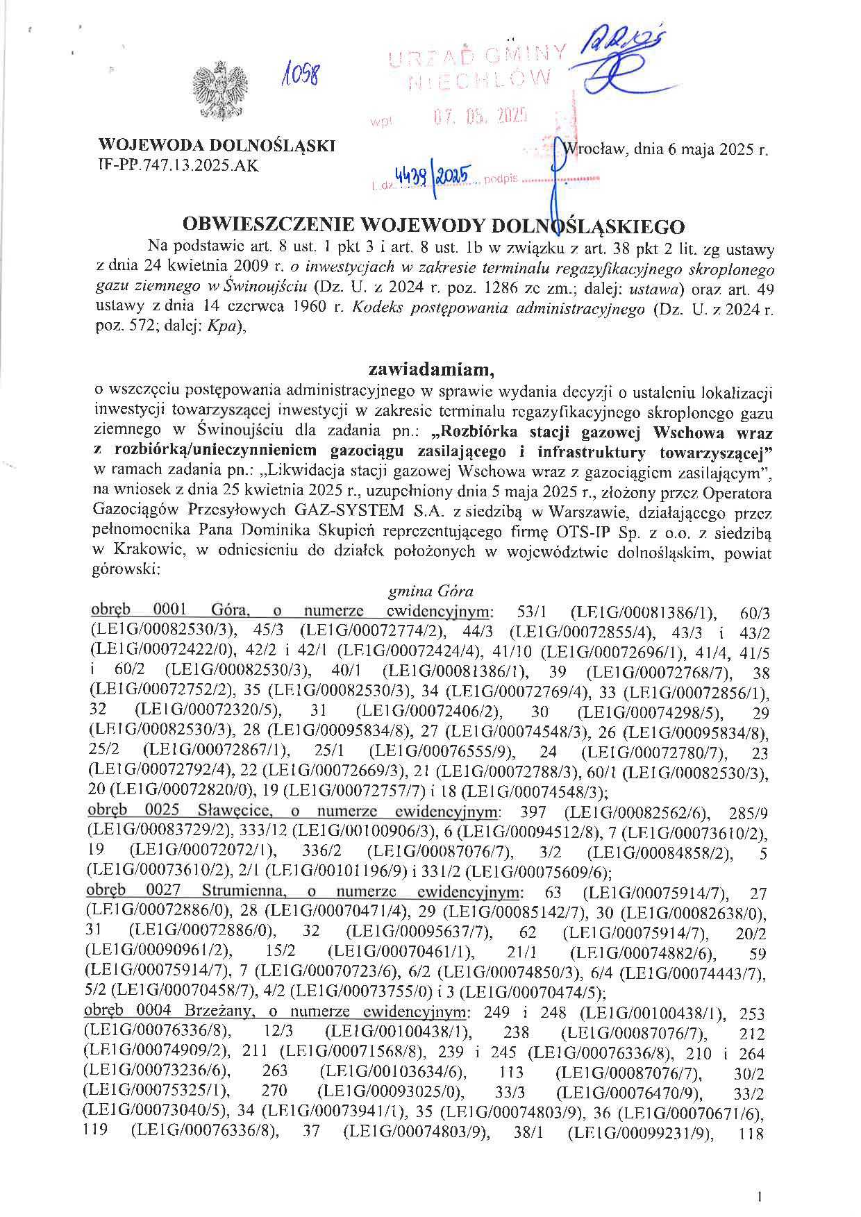 Obwieszczenie Wojewody Dolnośląskiego zawiadamiające o wszczęciu postępowania administracyjnego w sprawie wydania decyzji o ustaleniu lokalizacji inwestycji towarzyszącej inwestycji w zakresie terminalu regazyfikacyjnego skroplonego gazu ziemnego w Świnoujściu dla zadania pn.: ,,Rozbiórka stacji gazowej Wschowa wraz z rozbiórką/unieczynnieniem gazociągu zasilającego i infrastruktury towarzyszącej" w ramach zadania pn.: ,,Likwidacja stacji gazowej Wschowa wraz z gazociągiem zasilającym", na wniosek z dnia 25 kwietnia 2025 r., uzupełniony dnia 5 maja 2025 r., złożony przez Operatora Gazociągów Przesyłowych GAZ-SYSTEM S.A. z siedzibą w Warszawie, działającego przez pełnomocnika Pana Dominika Skupień reprezentującego firmę OTS-IP Sp. z o. o. z siedzibą w Krakowie, w odniesieniu do działek położonych w województwie Dolnośląskim, powiat górowski.