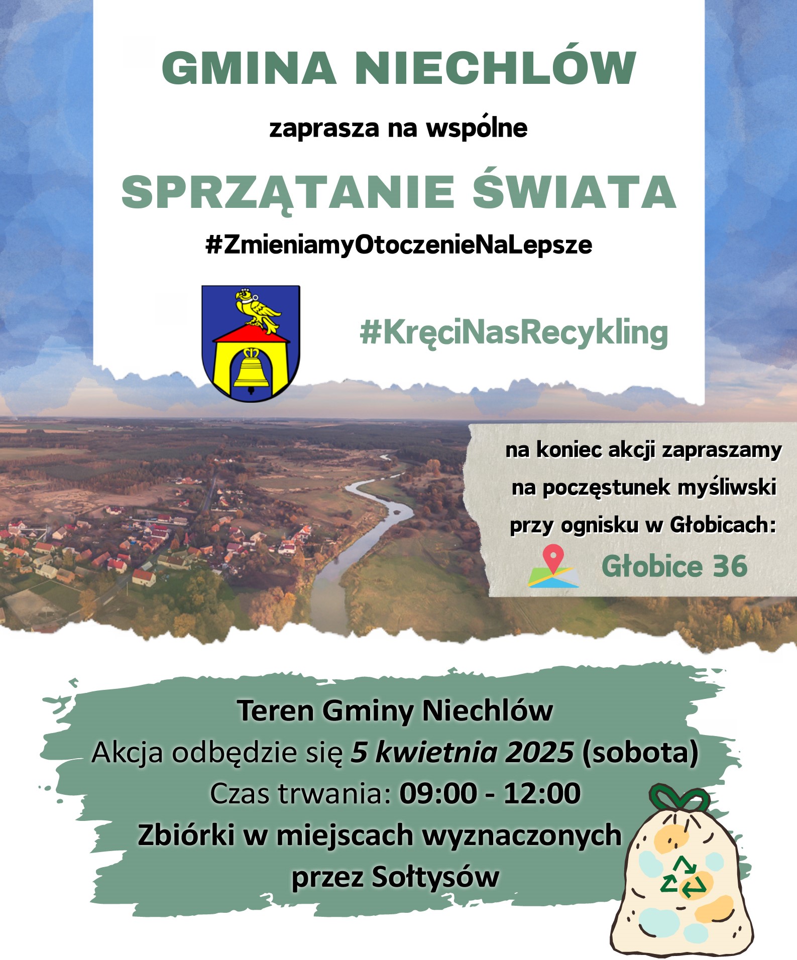 W sobotę, 5 kwietnia, zapraszamy wszystkich mieszkańców do udziału w akcji Sprzątanie Świata w Gminie Niechlów! Wspólnie zadbajmy o czystość naszych miejscowości.