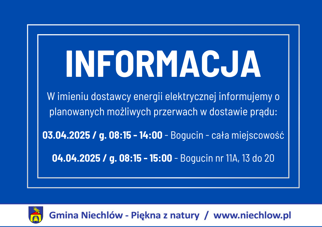 W imieniu dostawcy energii elektrycznej informujemy o planowanych możliwych przerwach w dostawie prądu w dn. 03.04 i 04.04.2025 r.