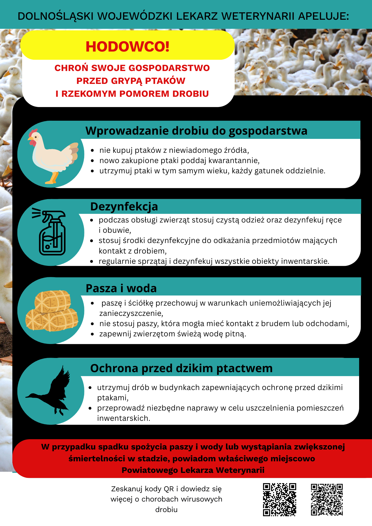 🚨 Powiatowy Lekarz Weterynarii w Górze informuje o wyjątkowo niekorzystnej sytuacji epizootycznej w kraju – odnotowano liczne ogniska grypy ptaków o wysokiej zjadliwości (HPAI) oraz rzekomego pomoru drobiu (Newcastle Disease – ND). Zagrożenie jest realne – apelujemy o wzmożoną czujność i przestrzeganie zasad bioasekuracji!