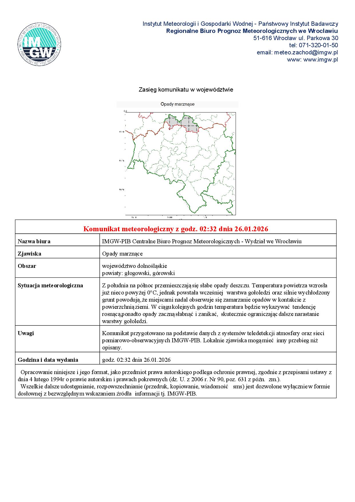 Instytut Meteorologii i Gospodarki Wodnej wydał komunikat meteorologiczny dla powiatu górowskiego dot. marznących opadów. Prosimy o zachowanie ostrożności na drogach oraz zachęcamy do zapoznania się z informacją.