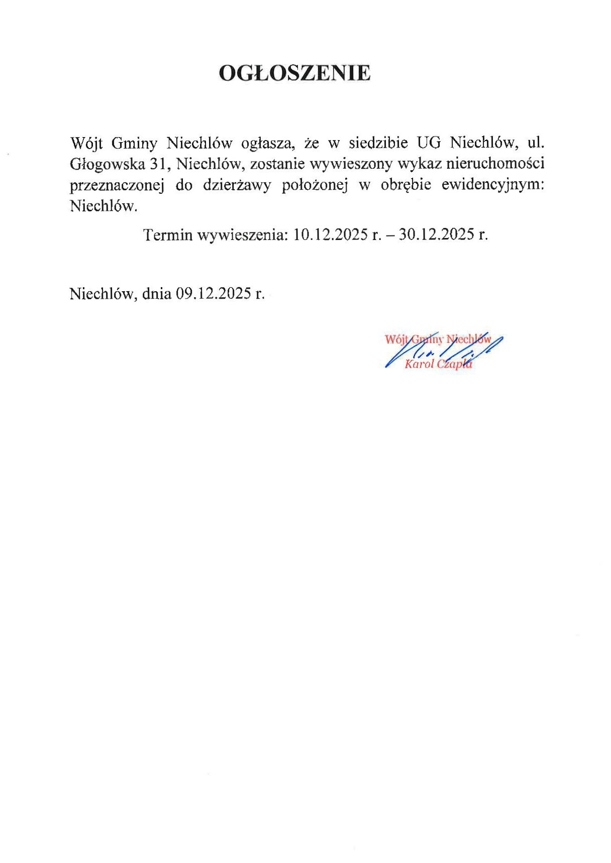 📢 Uprzejmie informujemy, że w dniu 23 grudnia 2025 r. Urząd Gminy Niechlów oraz Punkt Selektywnej Zbiórki Odpadów Komunalnych (PSZOK) będzie nieczynny z uwagi na dzień wolny za 01.11.2025 r. Za utrudnienia przepraszamy.